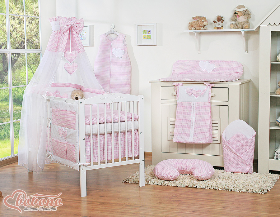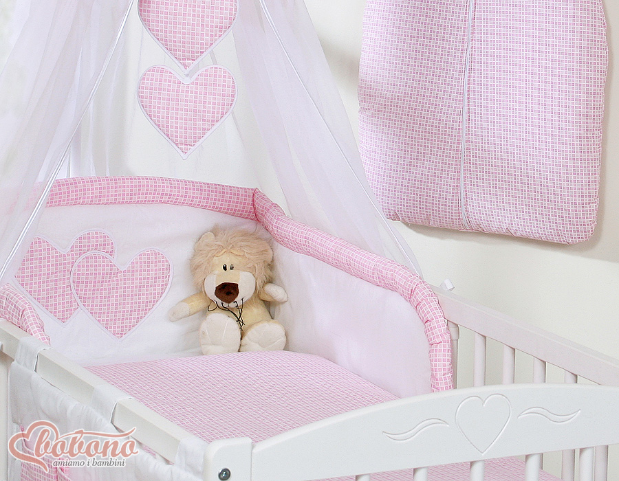 Stubenwagen » Bettwäsche für Babys » Bettwäsche für Babybett HERZEN » Bettwäsche Sets für Babybett 140cm » Bettwäsche Set 11-tlg mit Himmel » 100x135cm Bettwäsche Set 11-tlg mit Himmel - Hängende Herzen rosa kariert
