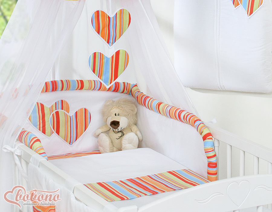 Stubenwagen » Bettwäsche für Babys » Bettwäsche für Babybett HERZEN » Bettwäsche Sets für Babybett 140cm » Bettwäsche Set 11-tlg mit Himmel » 11-tlg Babybettwäsche Set mit Himmel - Hängende Herzen orange gestreift