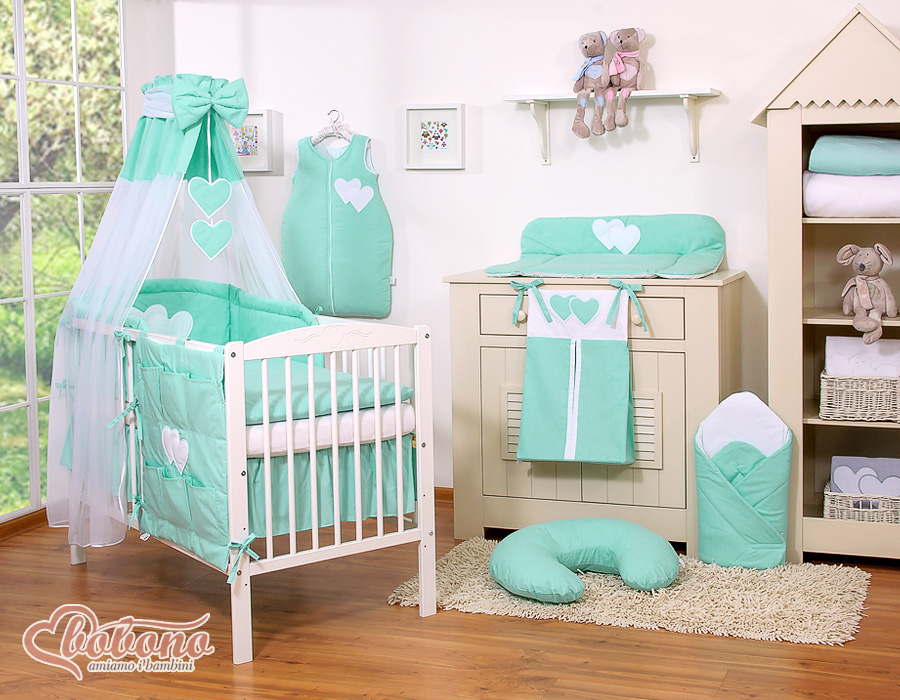 Stubenwagen » Bettwäsche für Babys » Bettwäsche für Babybett HERZEN » Bettwäsche Sets für Babybett 120cm » Bettwäsche Set 5-tlg mit Himmel » 60x120 Babybettwäsche Set 5-tlg - Hängende Herzen Minze