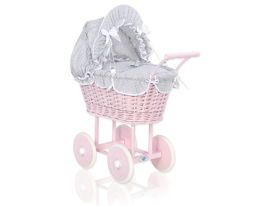 Stubenwagen » Spielzeug Kuscheltiere » Puppenwagen und Spielzeug » Puppenwagen aus Weide » Altrosa Retro Puppenwagen Bettwäsche Grau mit Weiß Punktemuster nr 81699-535