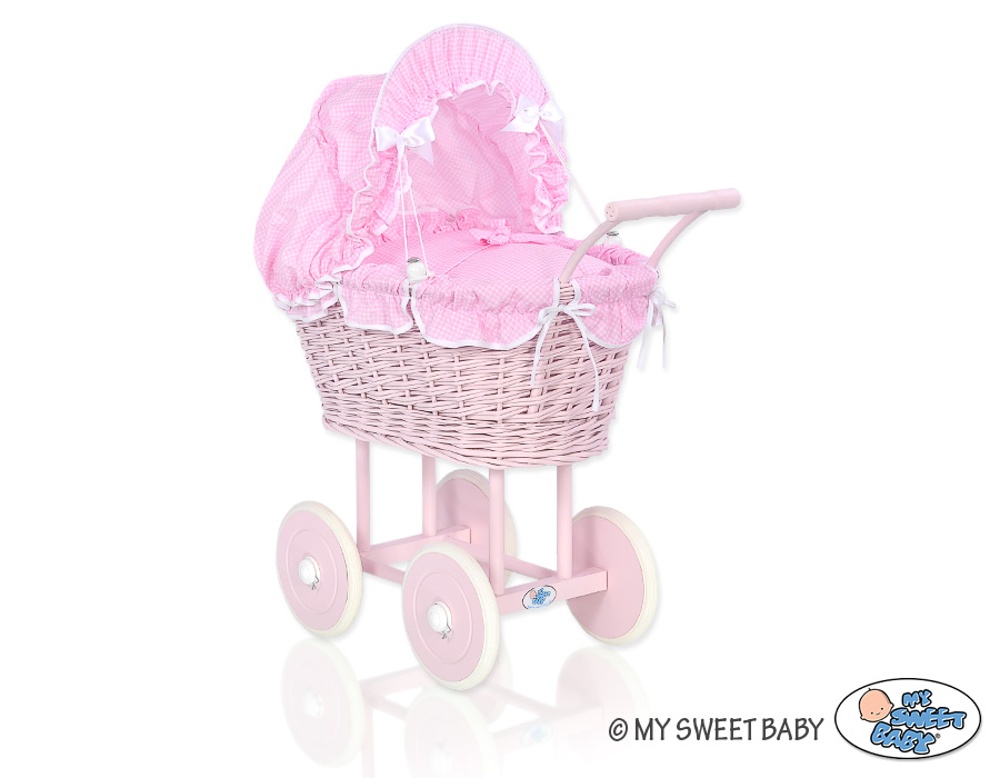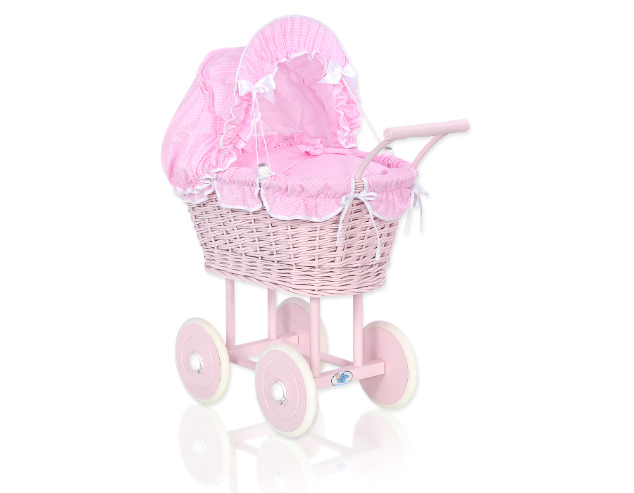Stubenwagen » Spielzeug Kuscheltiere » Puppenwagen und Spielzeug » Puppenwagen aus Weide » Altrosa Vintage Puppenwagen Bettwäsche Rosa Kariert nr 81699-377