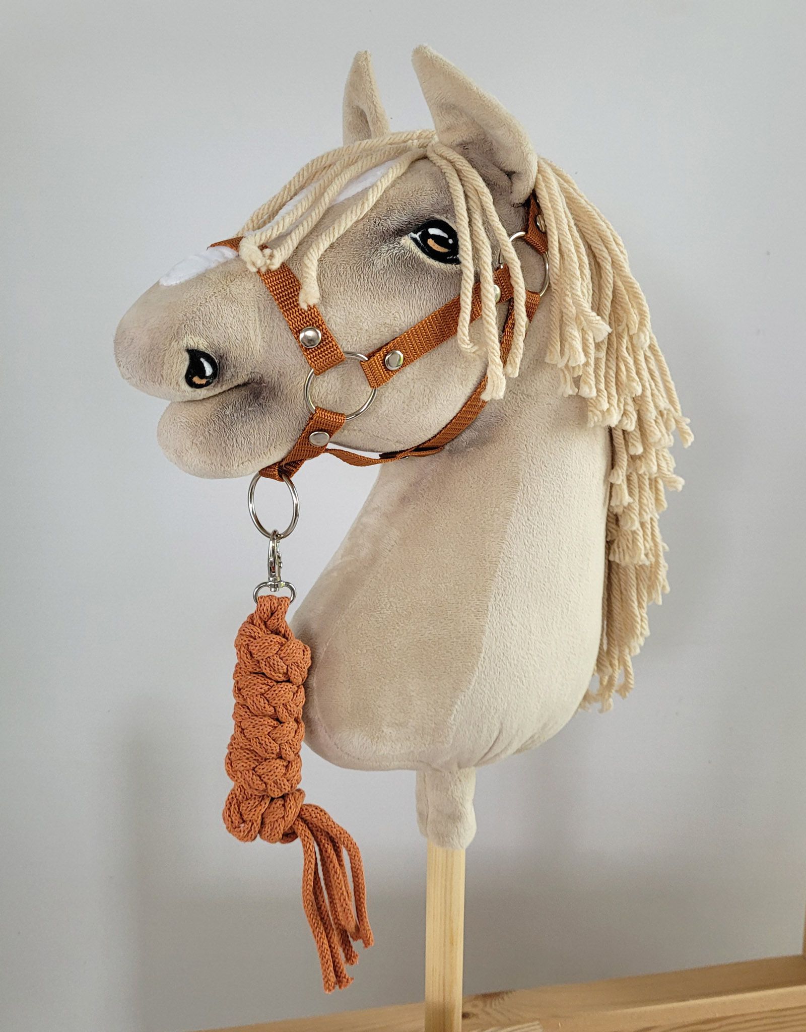 Ein hochwertiger, handgefertigter weicher Halfter für Hobby Horse. Der Halter ist sorgfältig aus einer starken, doppelt geflochtenen Baumwollschnur mit einem Durchmesser von 5 mm geflochten. Der Anbindestrick ist angenehm im Gebrauch, verursacht keine Schürfwunden und ist nicht allergen.