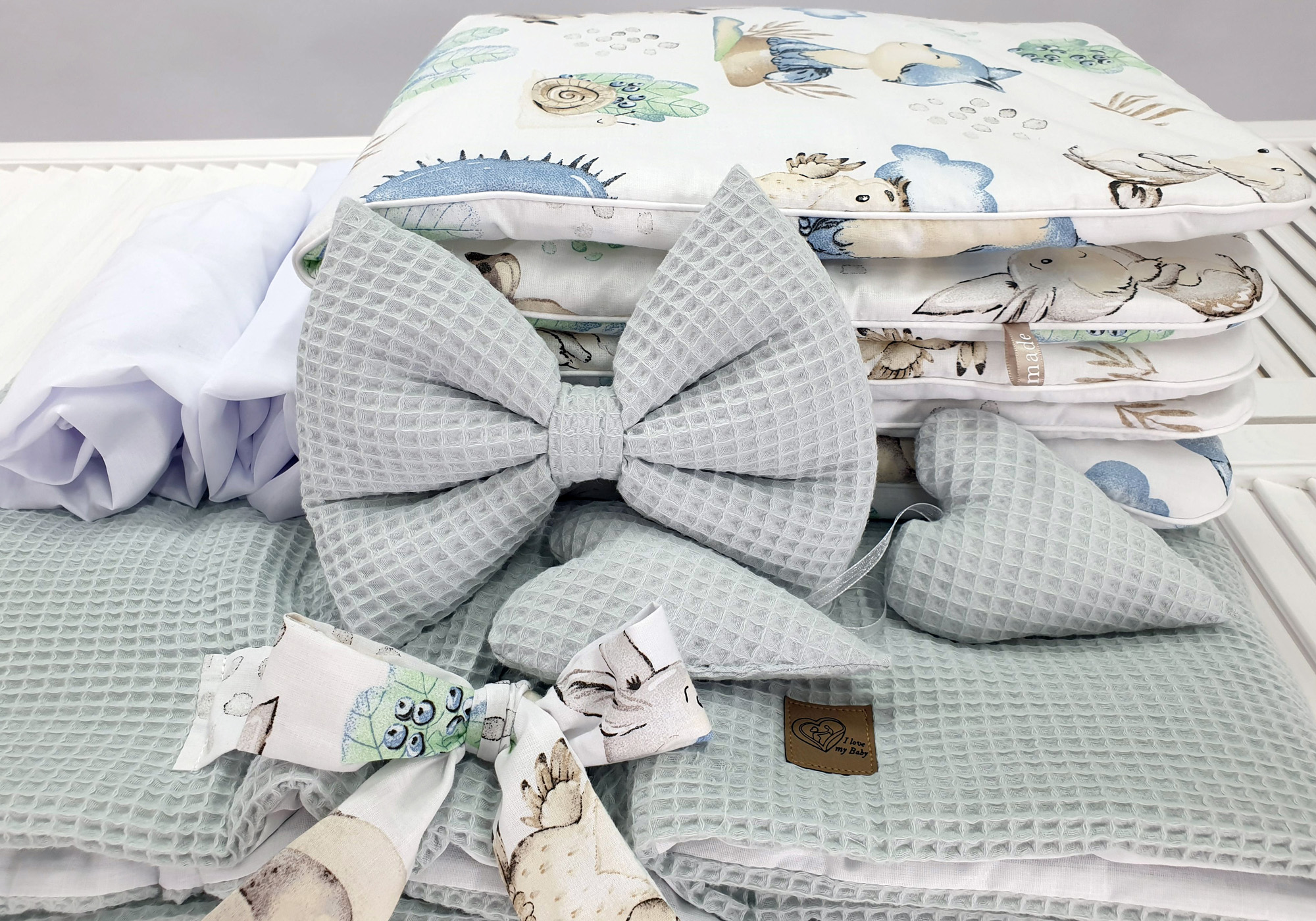Die Bestandteile des 5-teiligen Bettwäsche-Sets (Waffelstruktur) in grau (Igel):