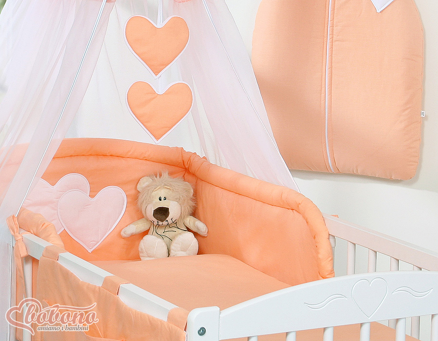 Stubenwagen » Bettwäsche für Babys » Bettwäsche für Babybett HERZEN » Bettwäsche Sets für Babybett 140cm » Bettwäsche Set 11-tlg mit Himmel » Baby Bettset 140x70 Kinderbett 11-tlg mit Himmel - Hängende Herzen pfirsich