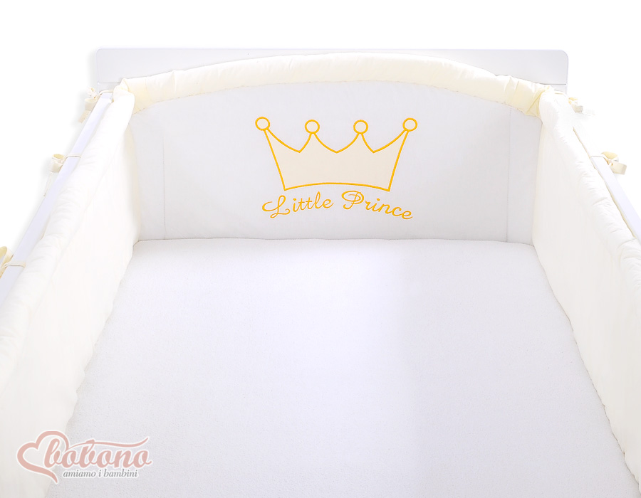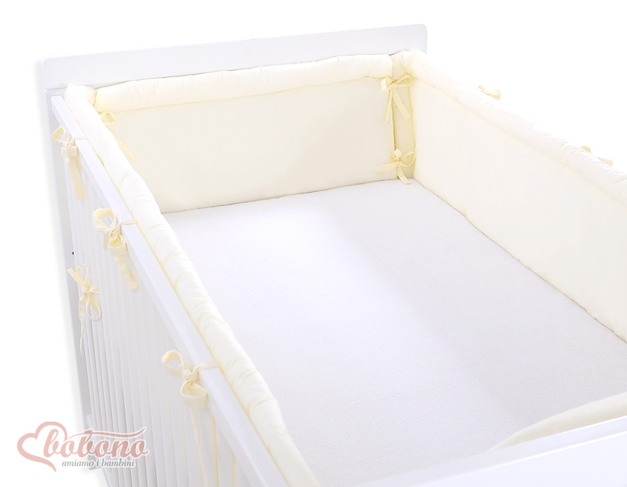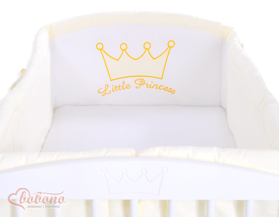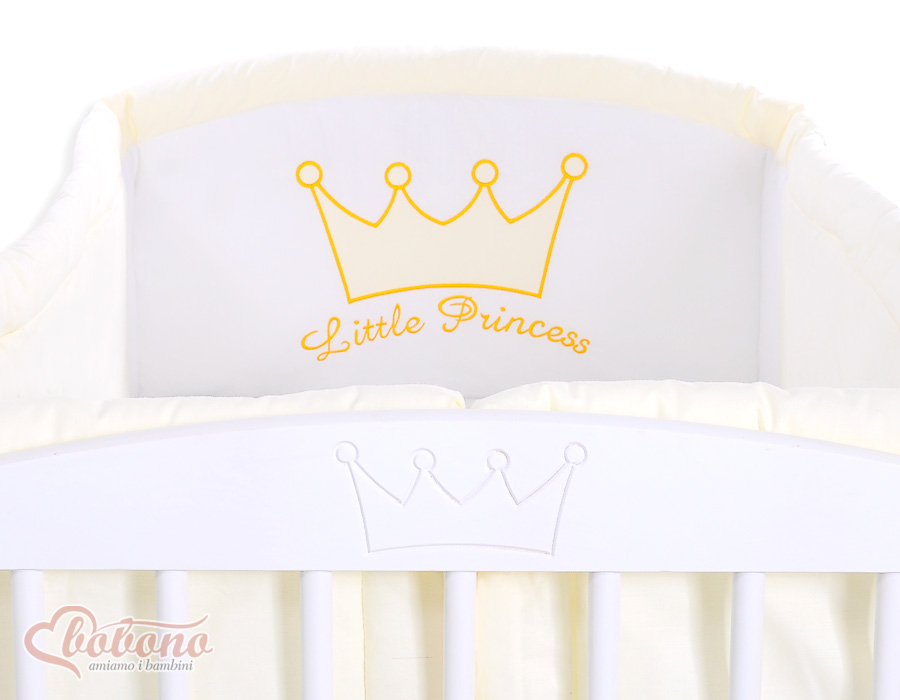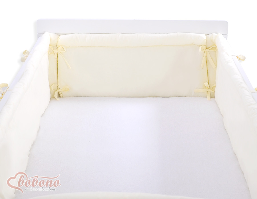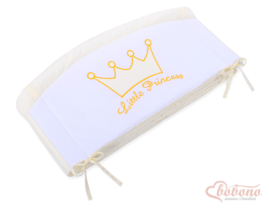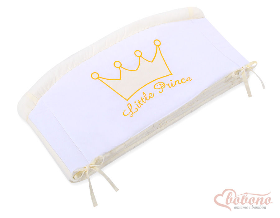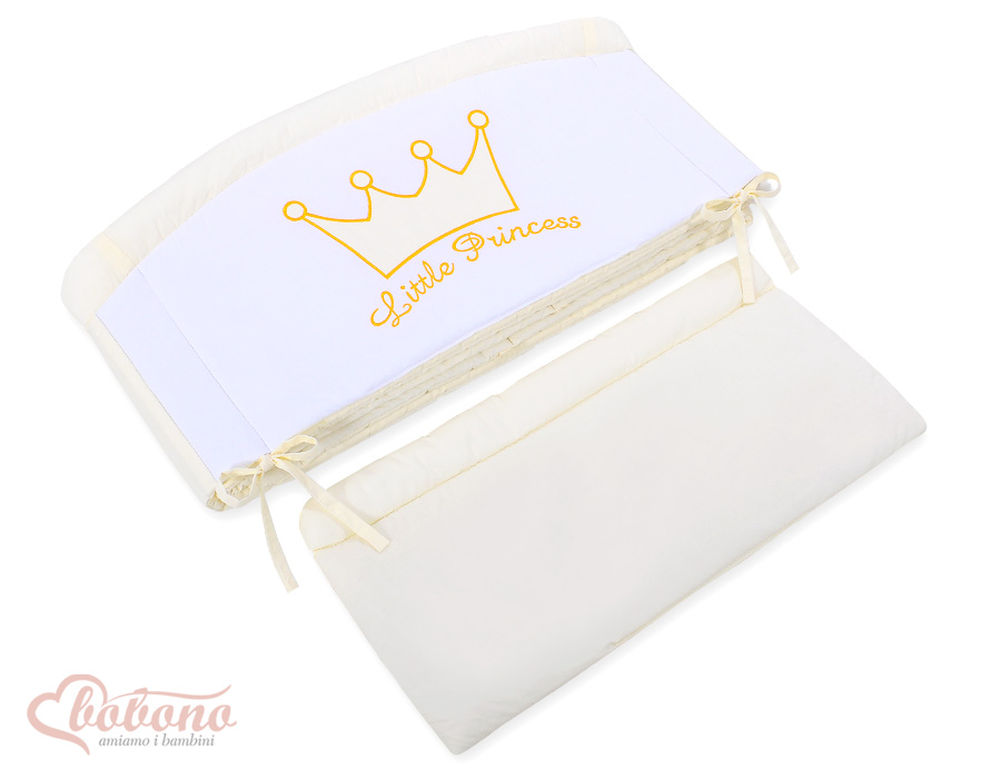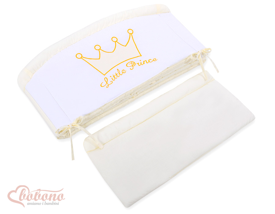 Besteht aus zwei separaten Teilen. Durch seine zusätzlichen Seitennähte passt er sowohl auf ein Bettchen 120x60 als auch 140x70 cm. Die obere Kante ist gerundet und gepolstert. Der Kopfschutz ist mit einer dicken, antialergischen, atmungsaktiven Silikongewebeschicht gepolstert. Die Füllung besitzt den Ökotex Zertifikat. An das Bettchen wird er mit soliden Schleifchen befestigt. Der Kopfteil mit Stickerei dekoriert.
