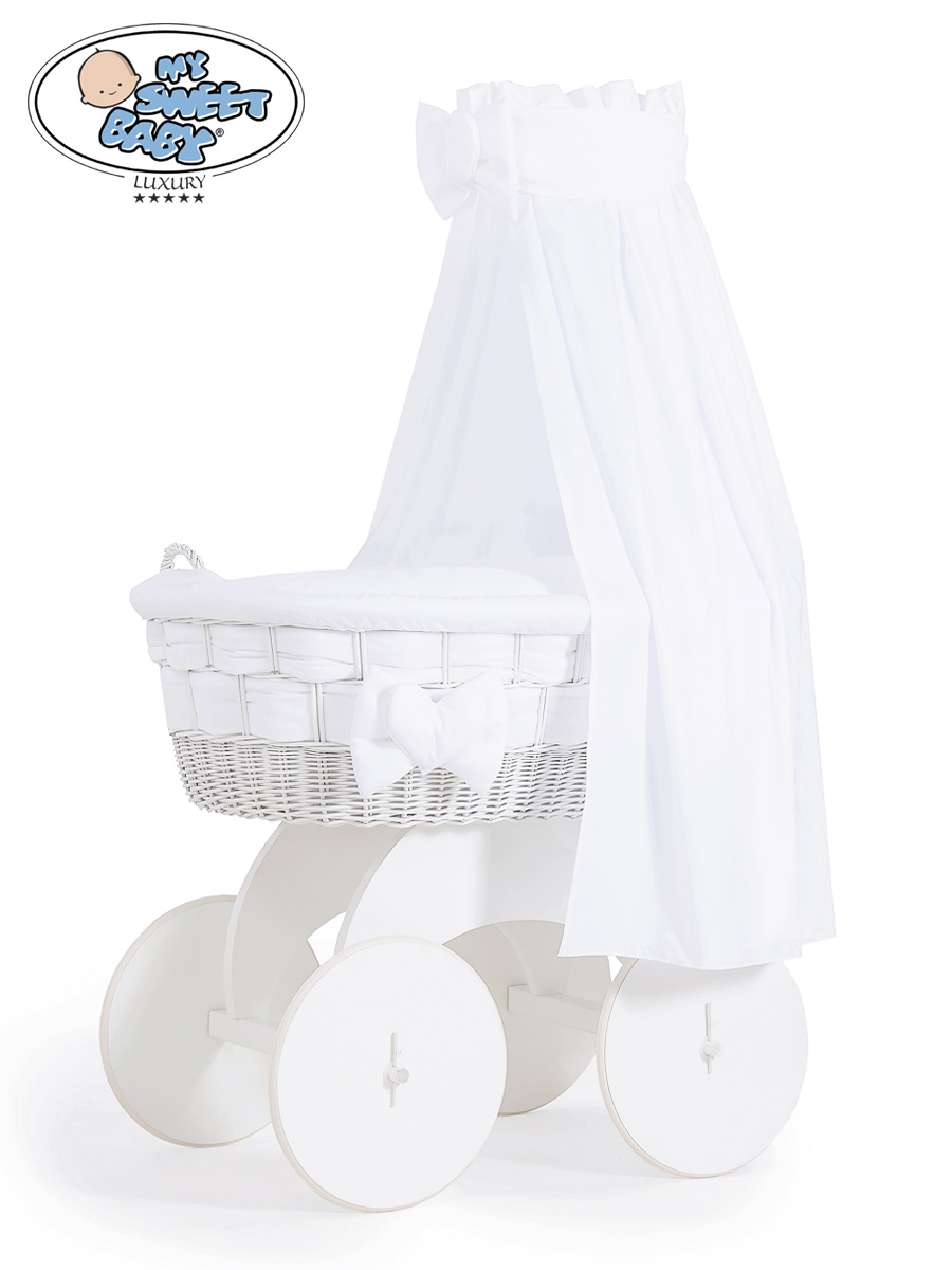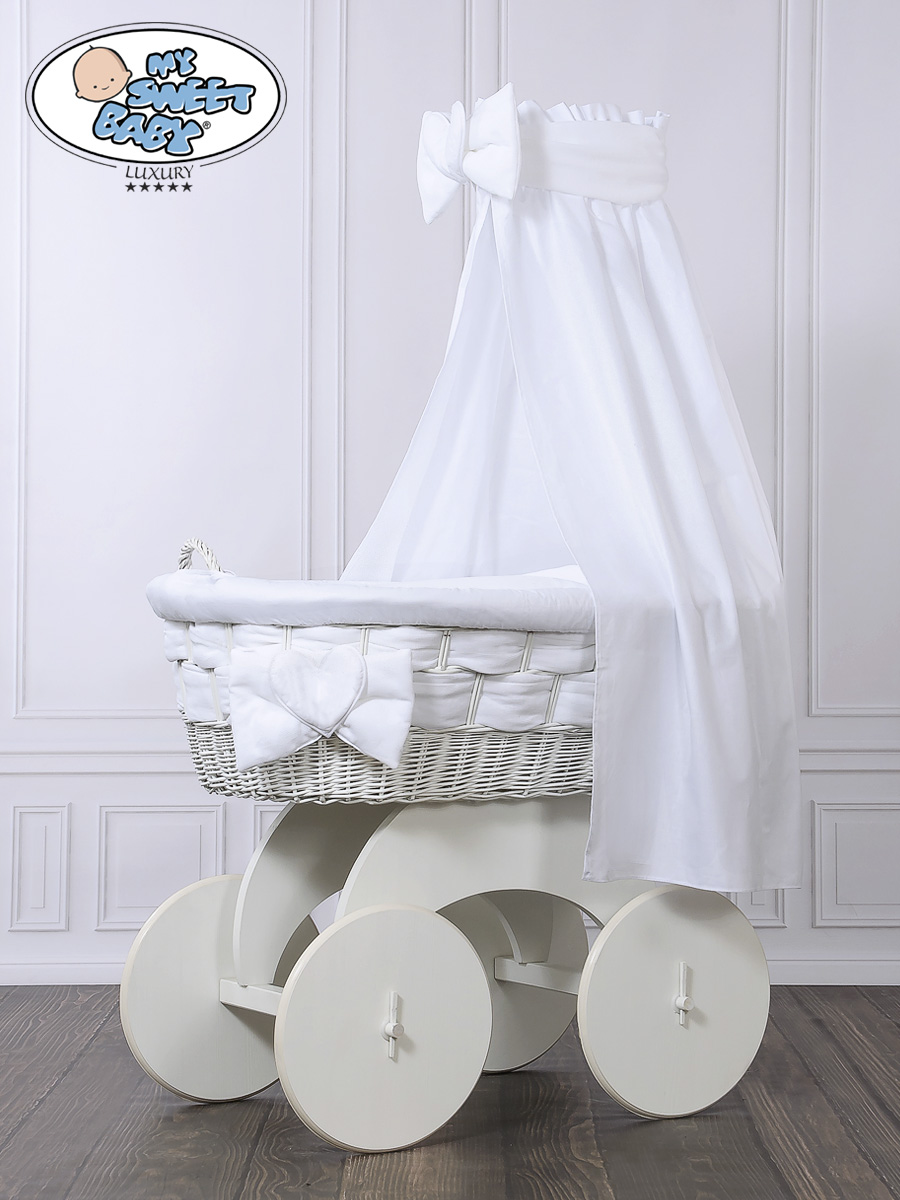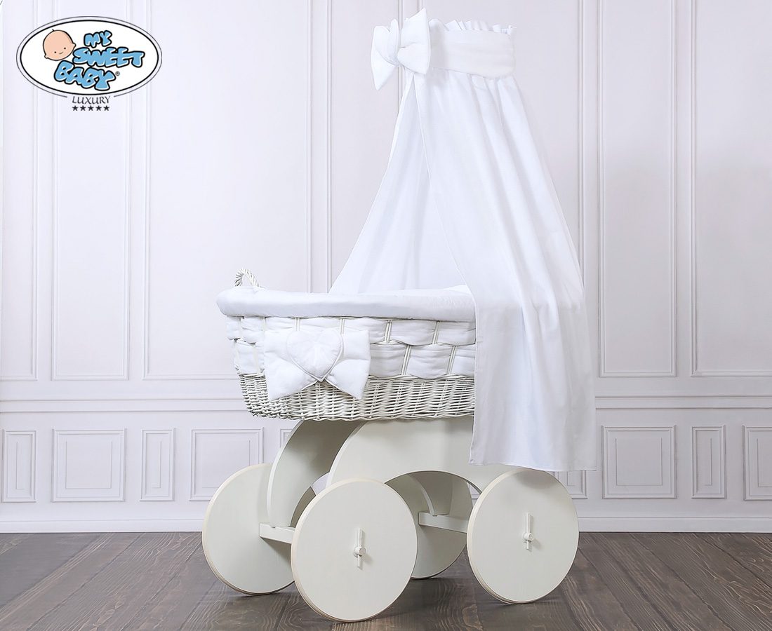 Ein wunderschöner handgemachter Stubenwagen, der ein gemütliches, Nest bildet. Weiße Farbe von Korb und Holz.
