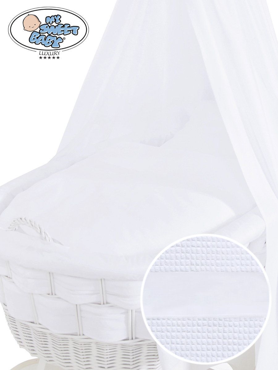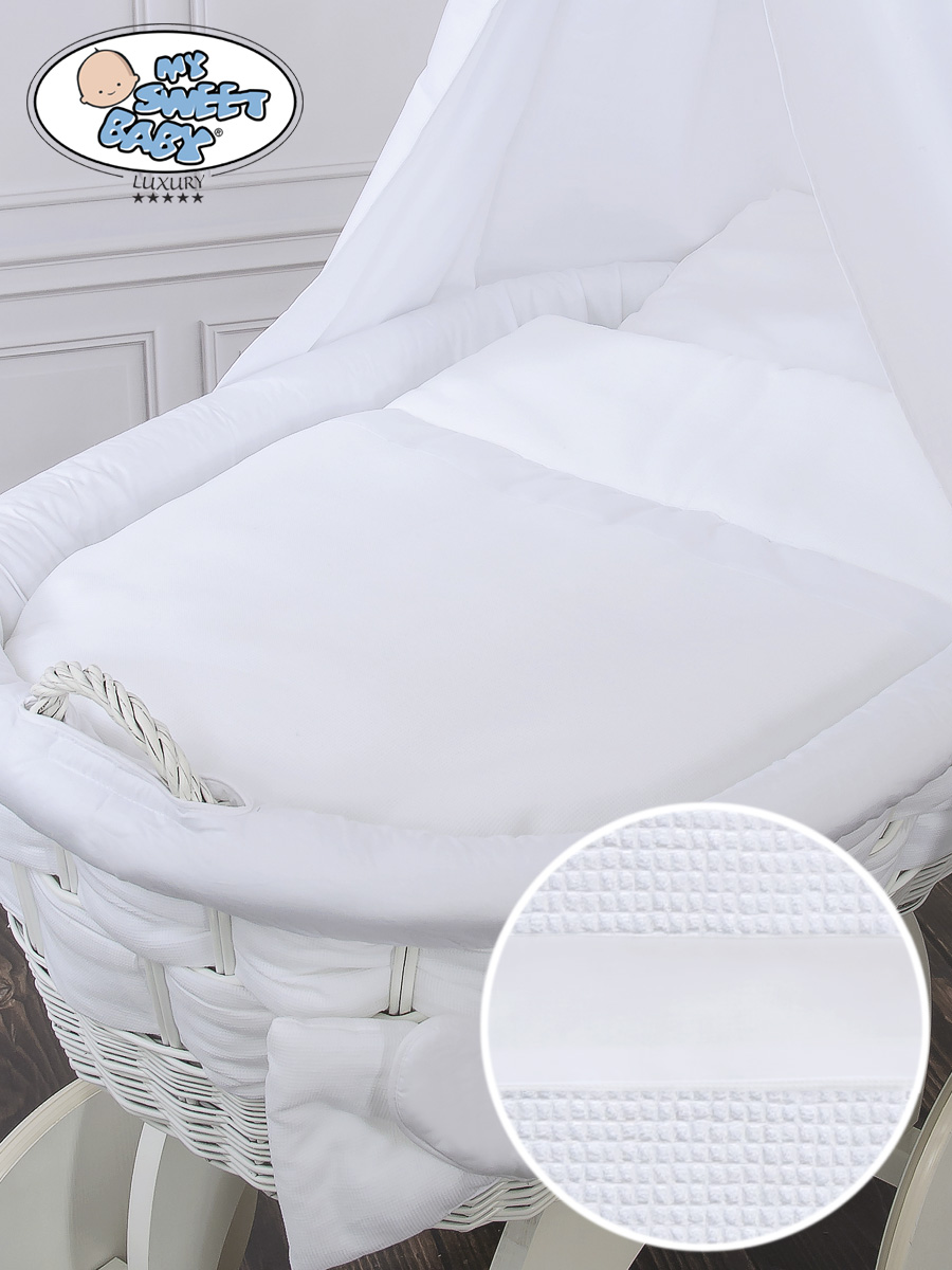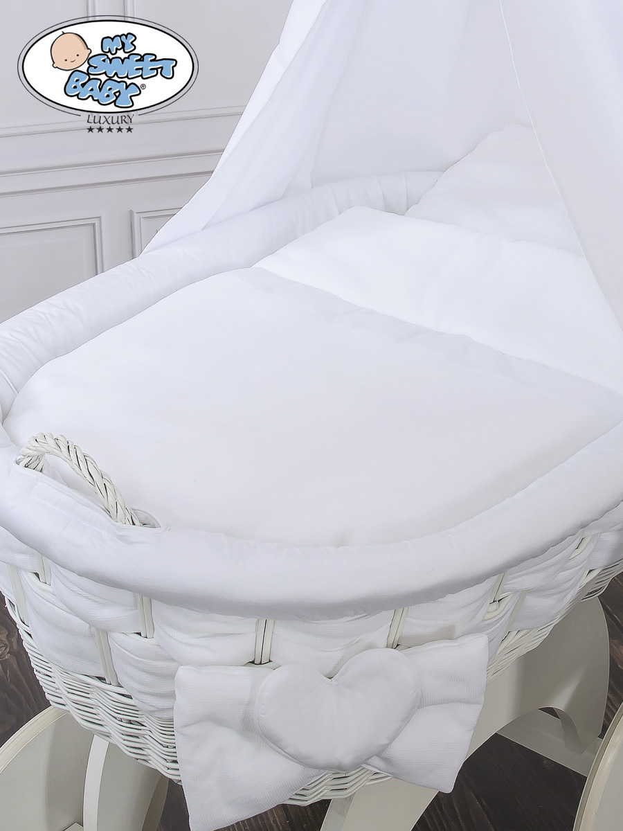 . Das Sortiment enthält auch ein Kissen (33x36cm) und eine Decke (75x65cm) (ohne separate Bettwäsche) mit einer speziellen Füllung aus Polyestergewebe. Die Füllung bietet einen optimalen  Schlafkomfort, ist sehr gesund und wird  für die Babys und Allergiker empfohlen. Decke und Kissen in den selben Farben wie der Korbbezug. Alle Elemente können in der Waschmaschine  gewaschen werden.