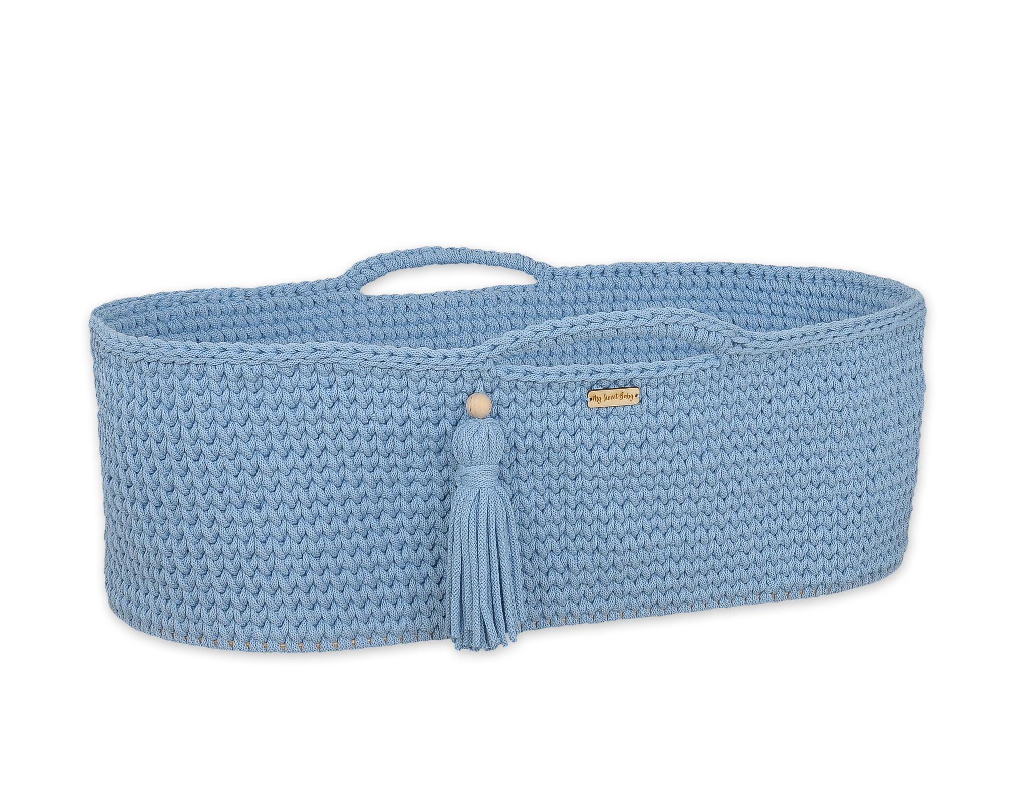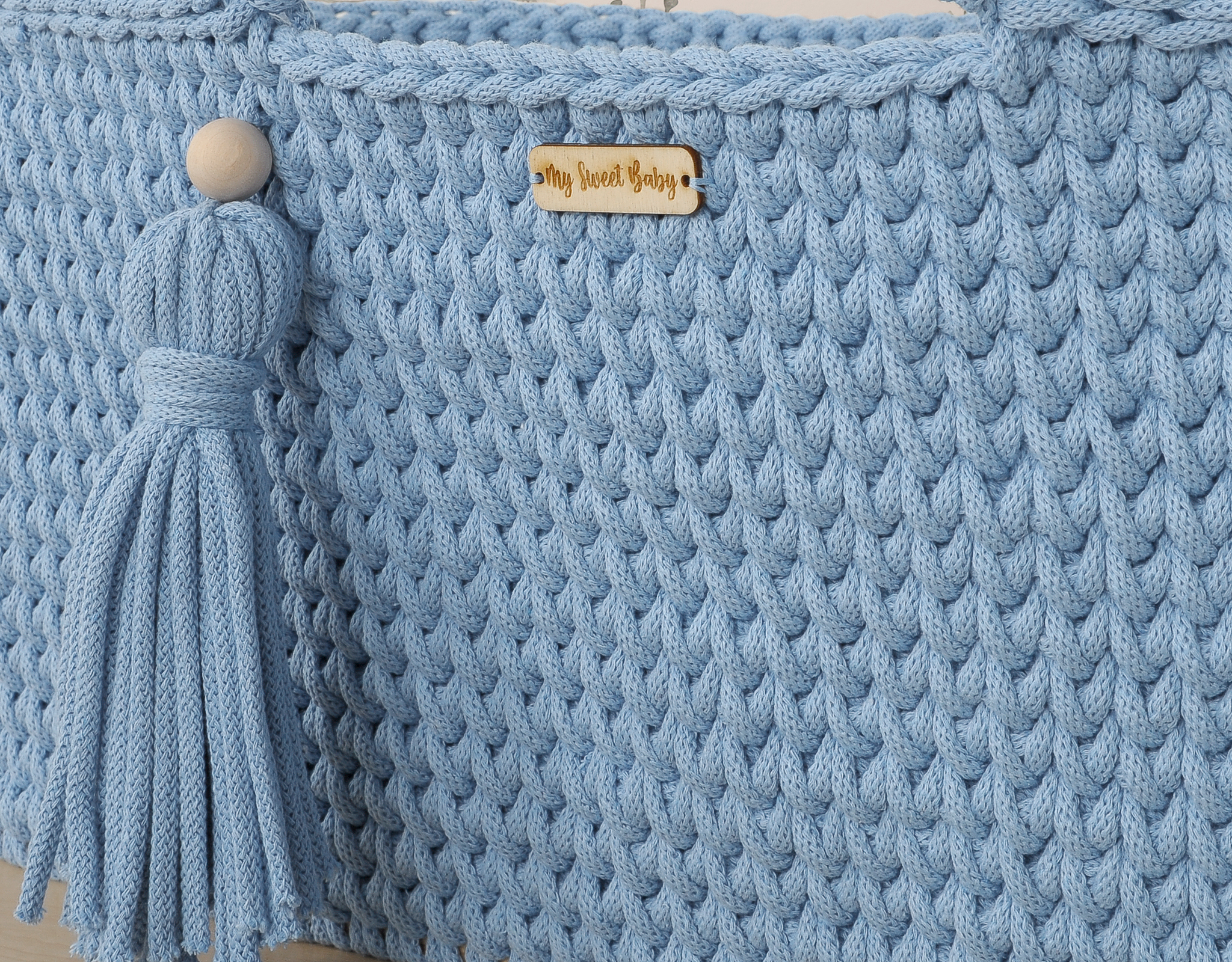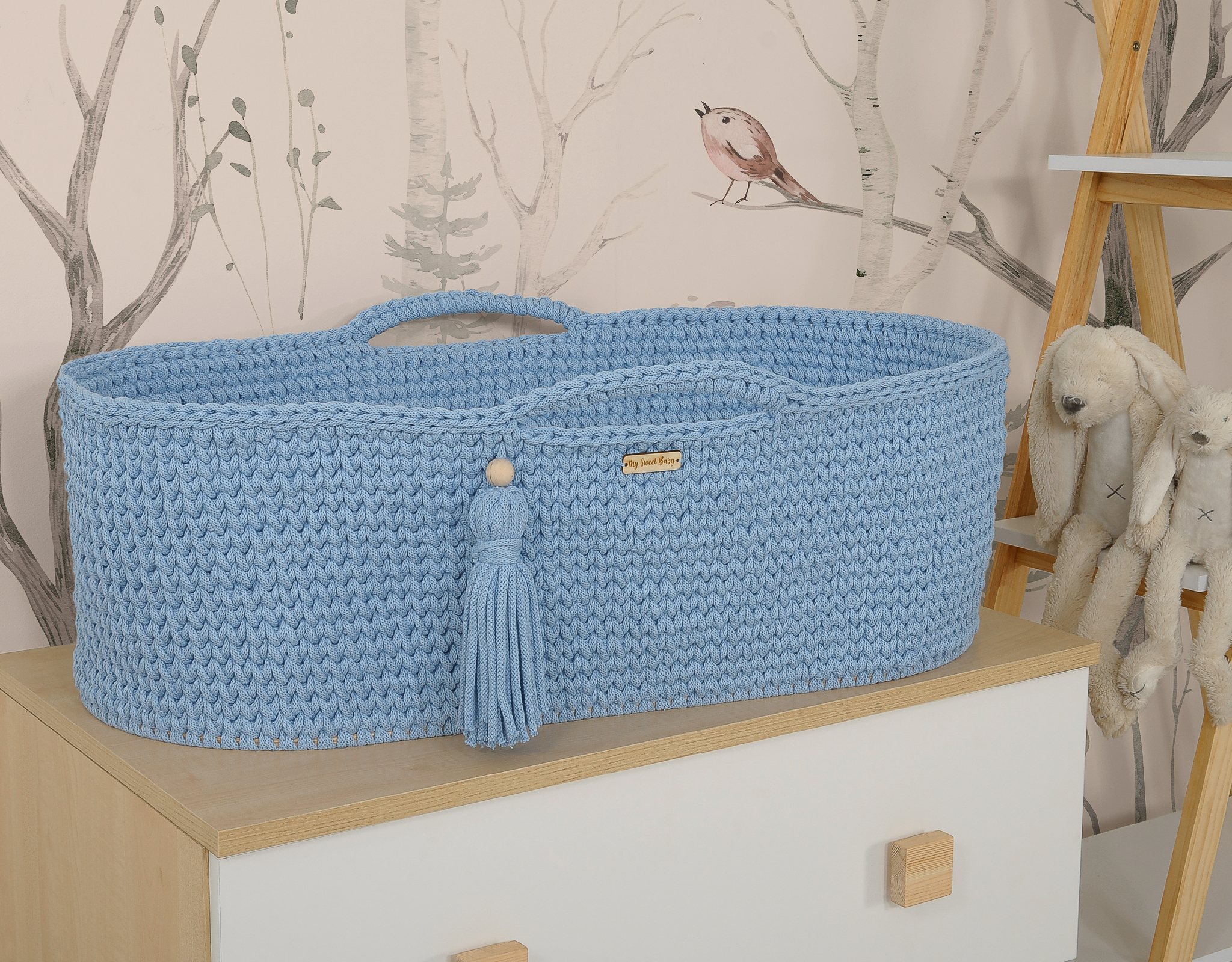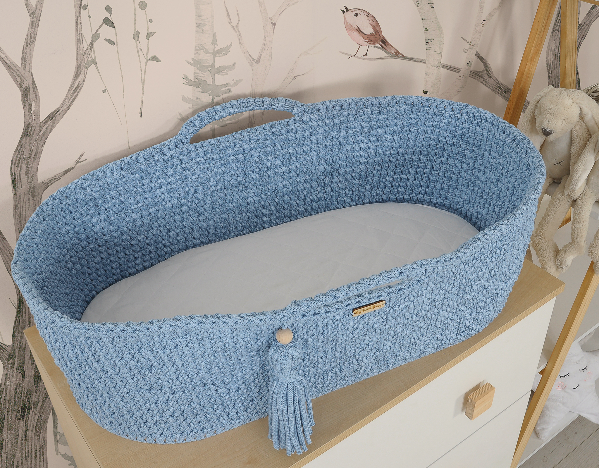 Baby Moseskorb geflochten Boho - blau Ein von Hand gefertigter Korb aus Baumwollschnur im Boho-Stil. Perfekt für jedes Kleinkind – es sorgt für sicheren und friedlichen Schlaf. Die Baumwollwände ermöglichen eine ausreichende Luftzirkulation. Die Matratze besteht aus dickem, gepresstem, zertifiziertem Vlies mit entsprechender Weichheit und abnehmbarem Bezug. Dank der Griffe lässt sich das Bettchen leicht tragen und das Kleinkind kann immer in Ihrer Nähe sein. Am Griff befindet sich ein handgefertigter Kordel in der Farbe des Korbes mit einer Holzperle.