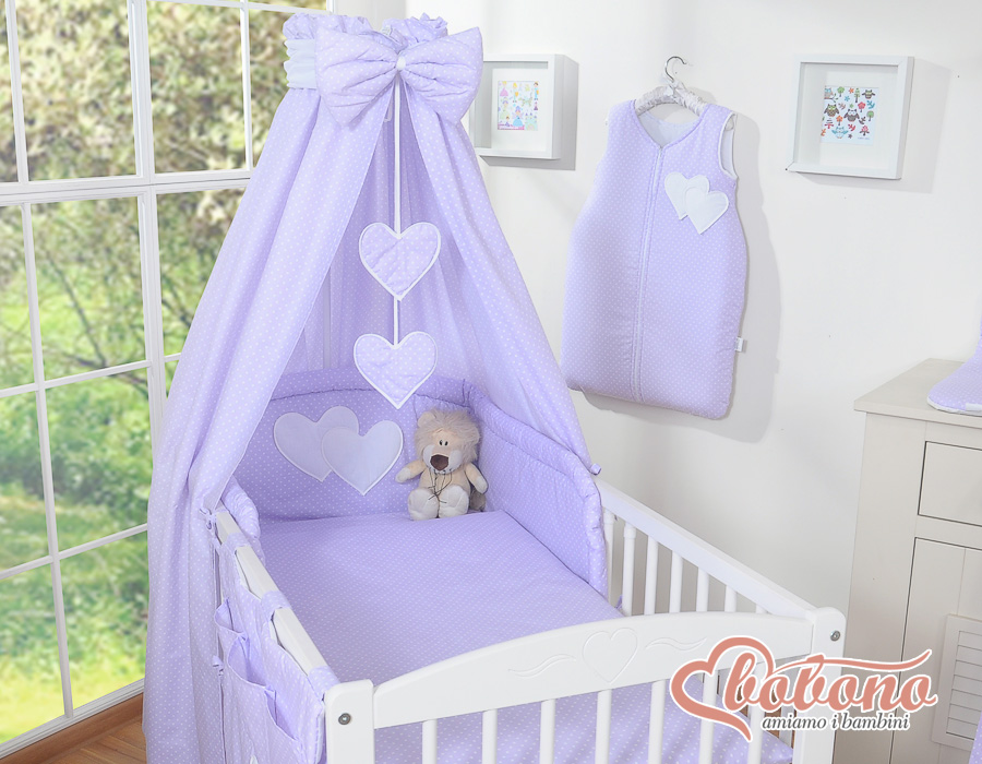 Babybett Bettwäsche Set 7-tlg mit Himmel - Hängende Herzen Lila-Punkmuster