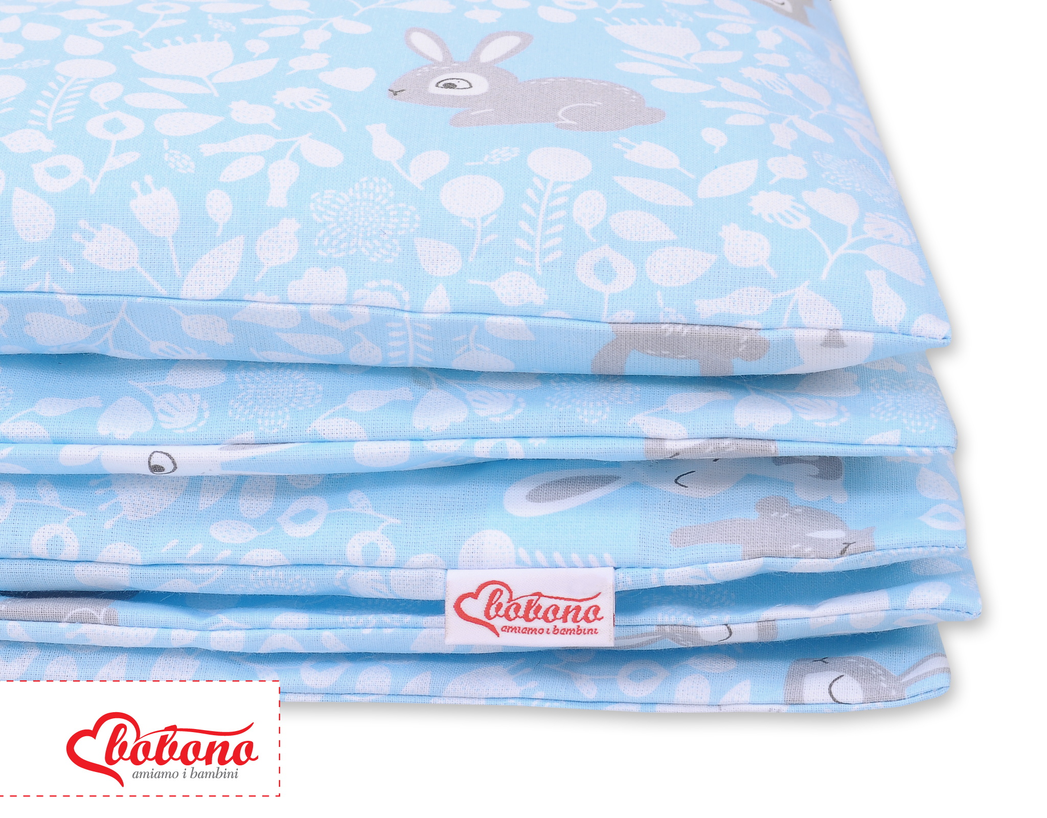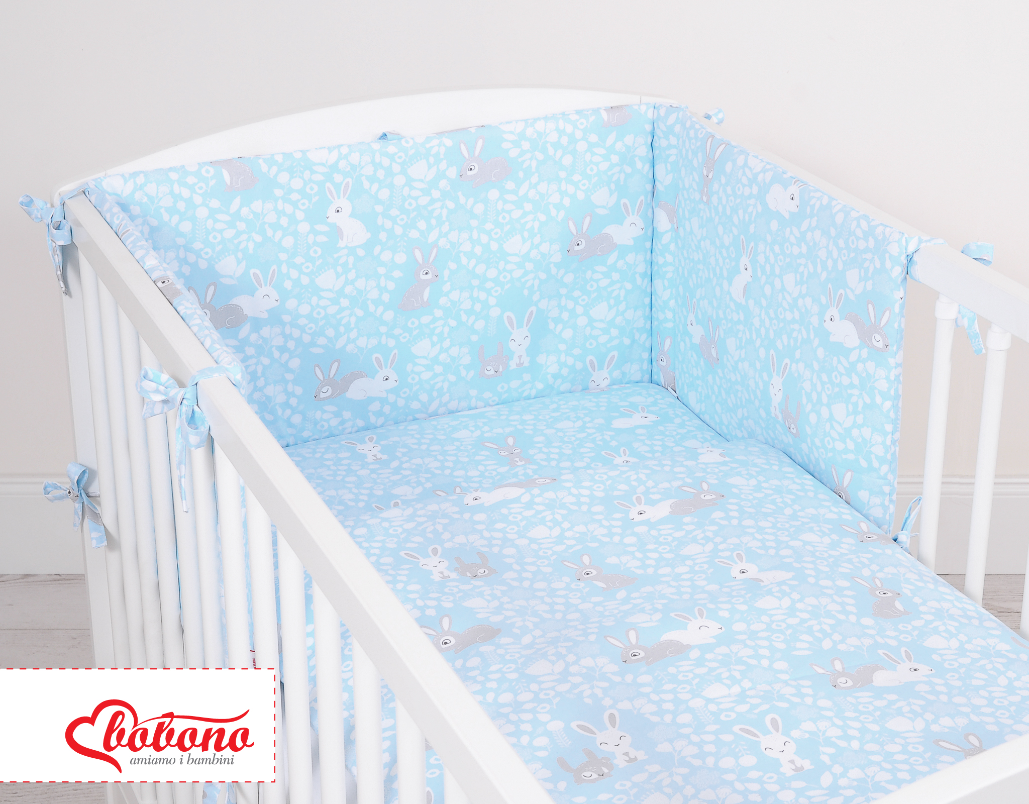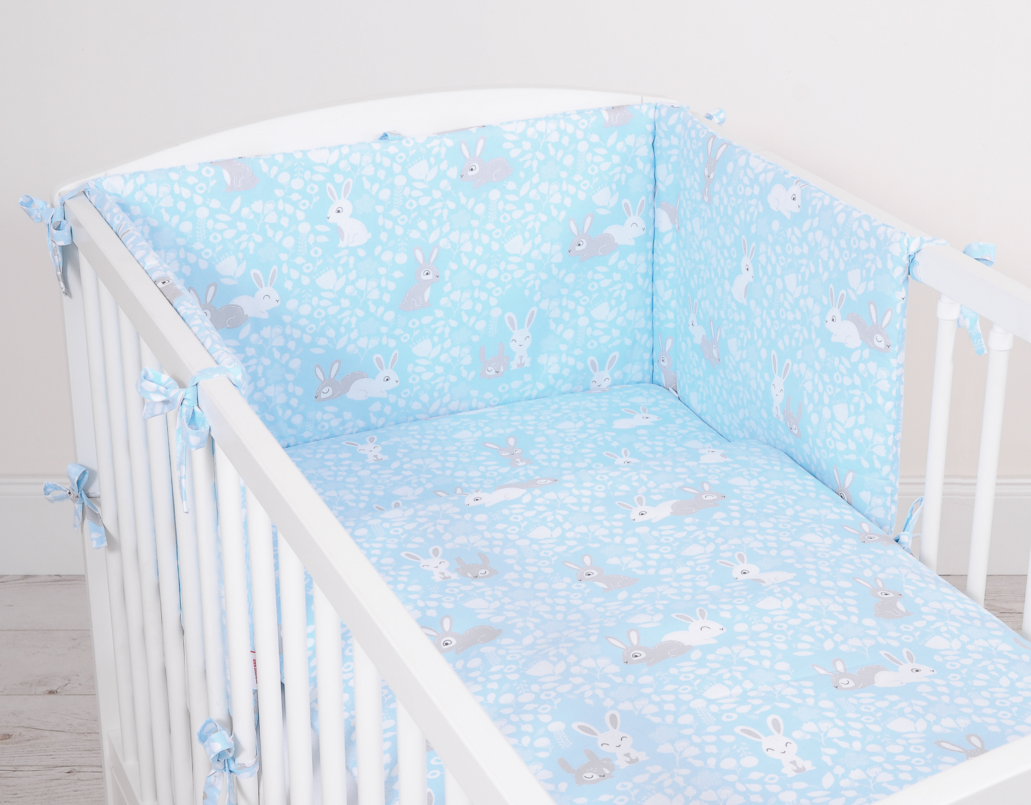 Babybett Bettwäsche Set 2-tlg - blaue Hasen In der bunte KinderBettwäsche verbringt der kleine Sprössling eine erholsame Nacht. Hochwertig aus Baumwolle gefertigt.