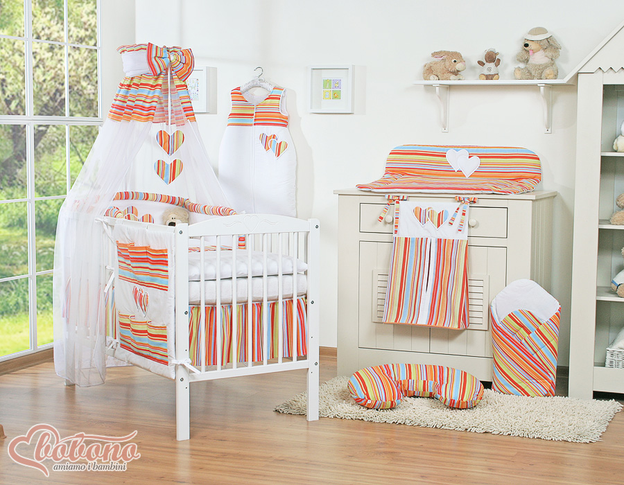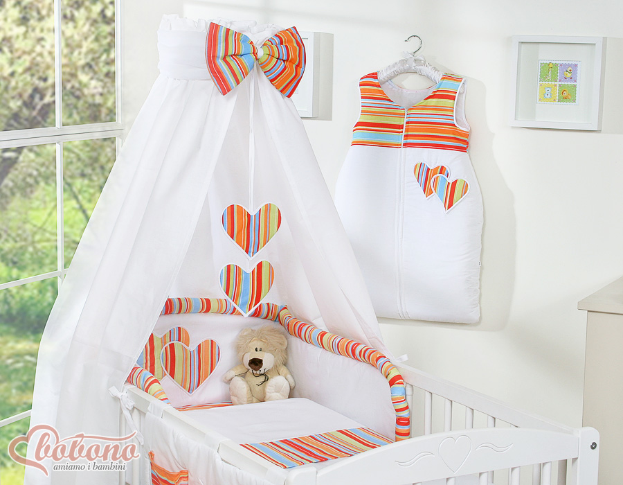 Babybett Bettwäsche Set 7-tlg mit Himmel - Hängende Herzen orange gestreift