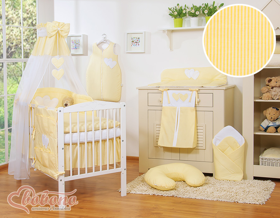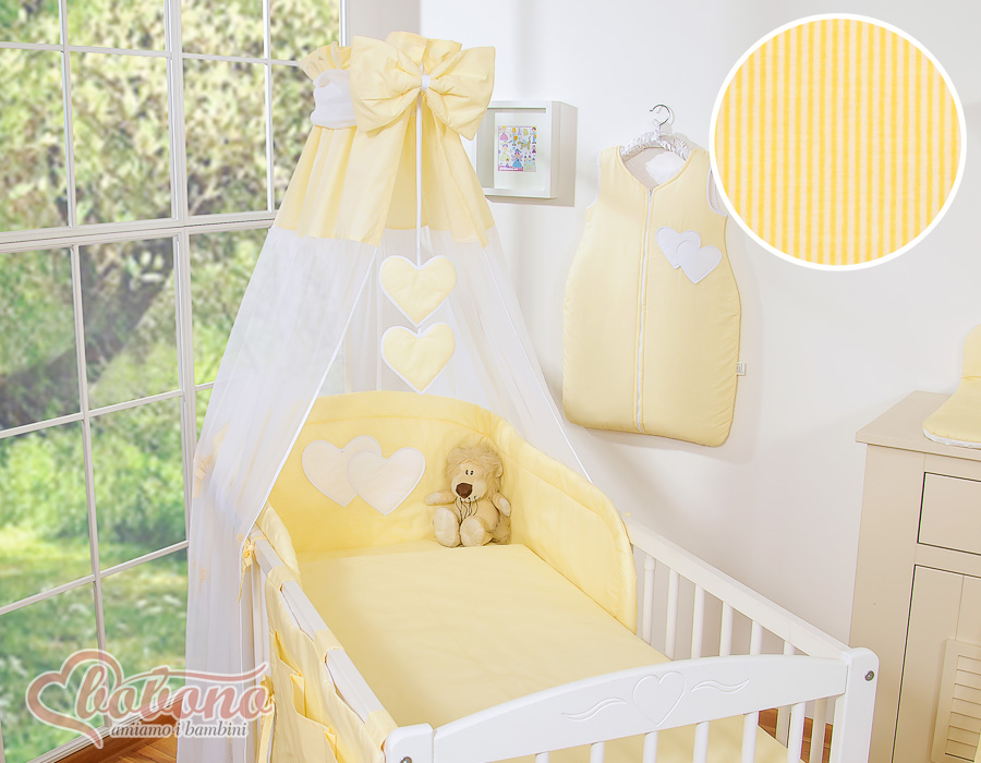 Stubenwagen » Bettwäsche für Babys » Bettwäsche für Babybett HERZEN » Himmel aus Chiffon » Babybett Himmel aus Chiffon - Hängende Herzen gelb gestreift