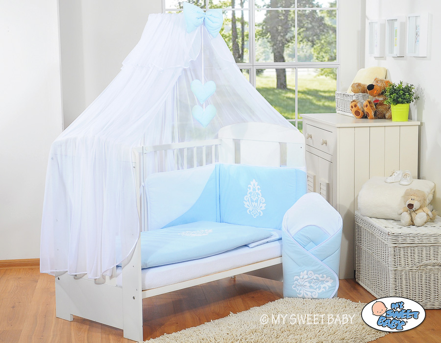 Stubenwagen » Bettwäsche für Babys » Bettwäsche für Babybett GLAMOUR » Moskitonetz » Babybett Moskitonetz aus Chiffon - Glamour blau-weiß