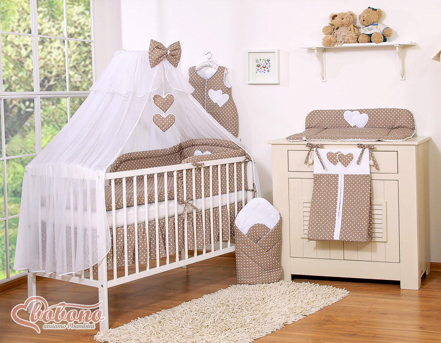 Stubenwagen » Bettwäsche für Babys » Bettwäsche für Babybett HERZEN » Moskitonetz » Babybett Moskitonetz aus Chiffon - Hängende Herzen Braun-Punktemuster