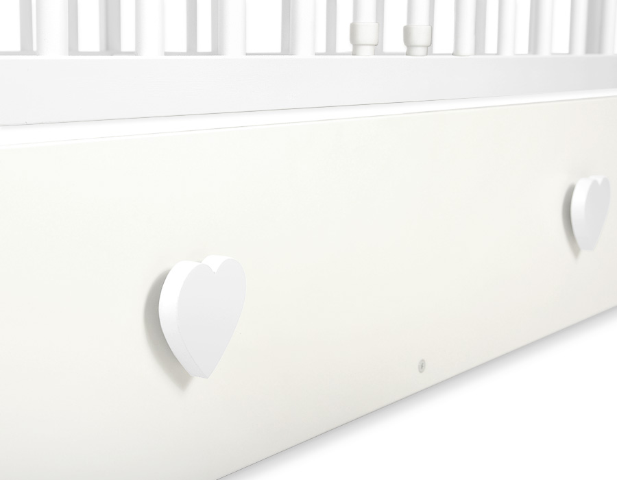 Eine geräumige, stabile und solide Schublade für Kinderbett 120x60cm mit dekorativen Griffen. Mehr Platz für Bettwäsche.