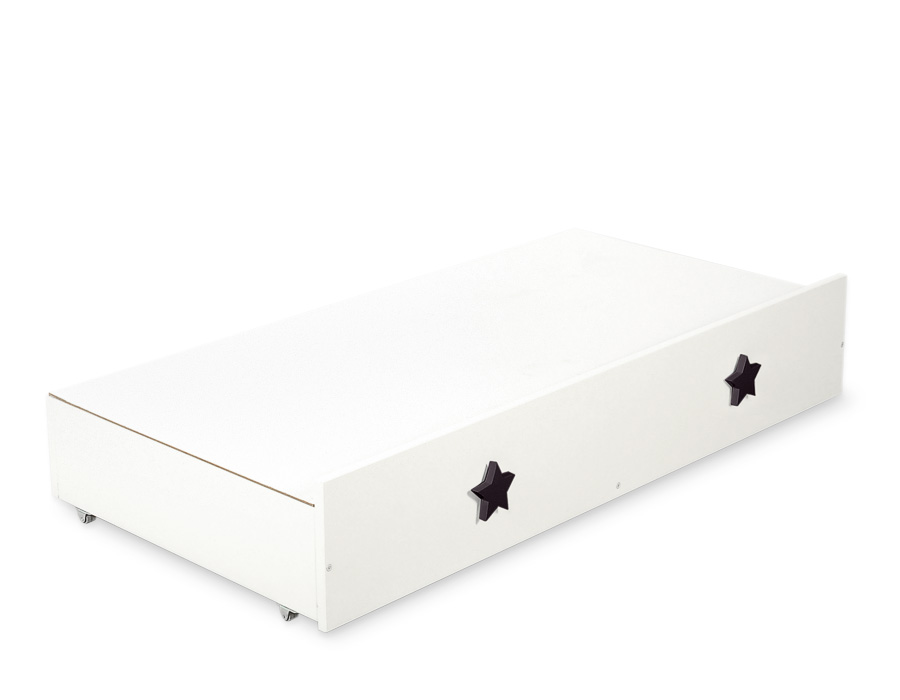 Eine geräumige, stabile und solide Schublade für Kinderbett 120x60cm mit dekorativen Griffen. Mehr Platz für Bettwäsche.