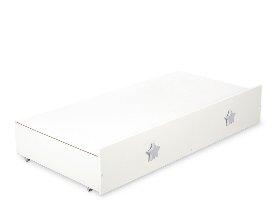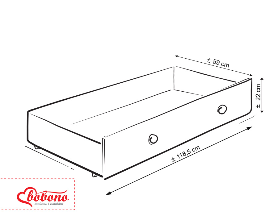 Eine geräumige, stabile und solide Schublade für Kinderbett 120x60cm mit dekorativen Griffen. Mehr Platz für Bettwäsche.