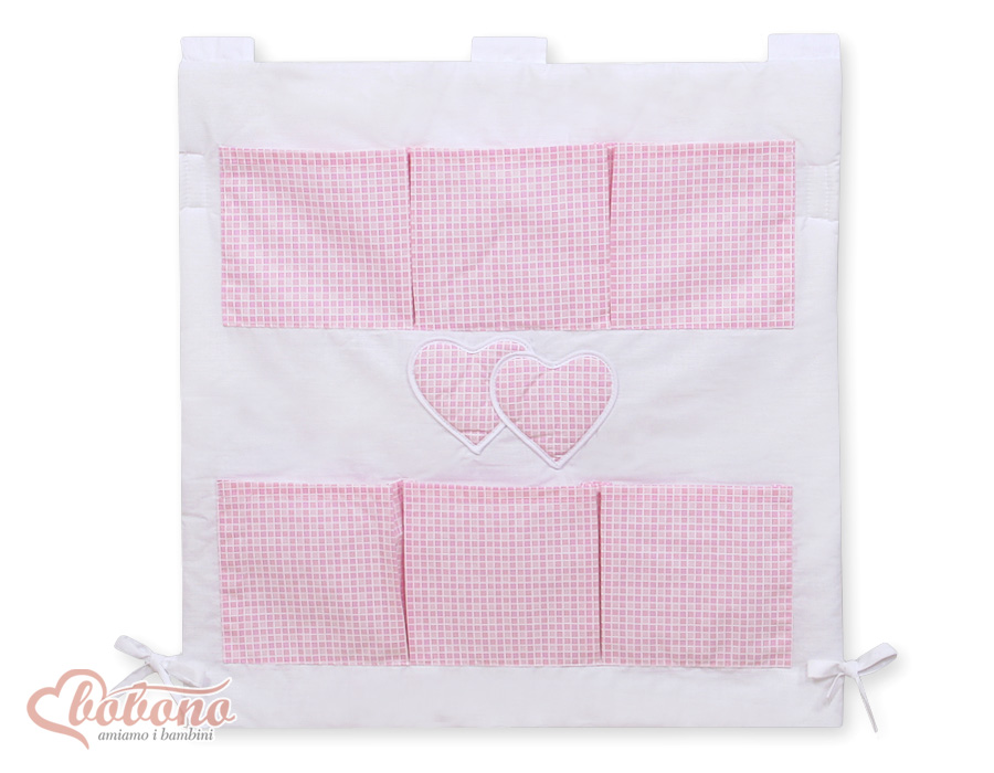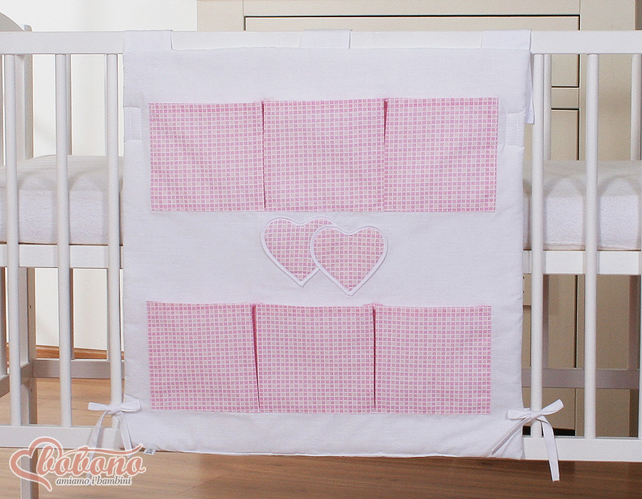 Babybetttasche - Hängende Herzen rosa kariert Betttasche mit 6 praktischen Aufbewahrungstaschen für Spielzeug, Windeln, Feuchttücher, Schnuller. Das Kuscheltier finden hier auch Platz.