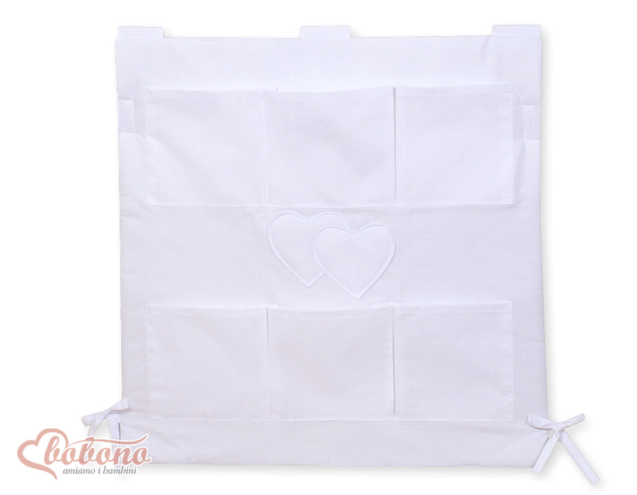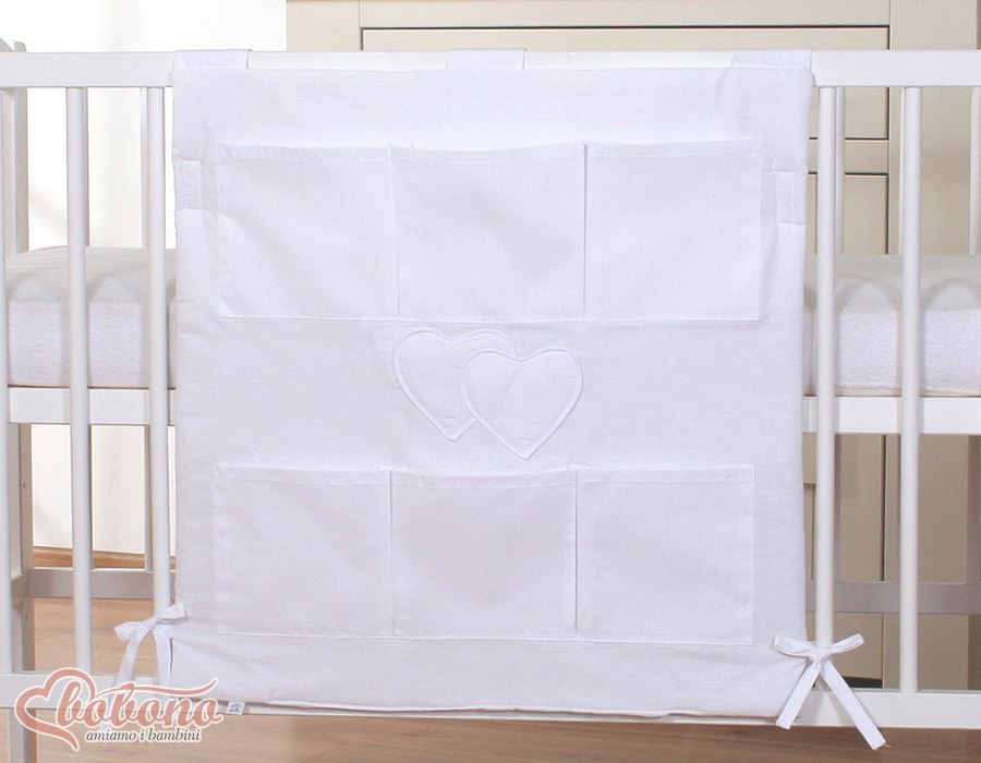 Babybetttasche - Hängende Herzen weiß Betttasche mit 6 praktischen Aufbewahrungstaschen für Spielzeug, Windeln, Feuchttücher, Schnuller. Das Kuscheltier finden hier auch Platz.