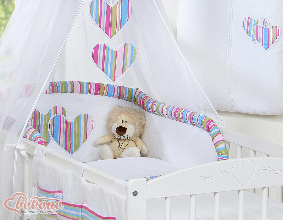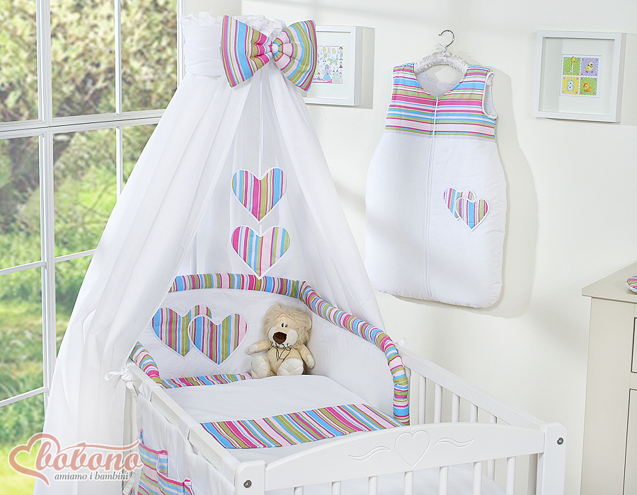 Stubenwagen » Bettwäsche für Babys » Bettwäsche für Babybett HERZEN » Bettwäsche Sets für Babybett 140cm » Bettwäsche Set 11-tlg mit Himmel » Babybettwäsche Set 11-tlg mit Himmel - Hängende Herzen lila gestreift 100x135 cm