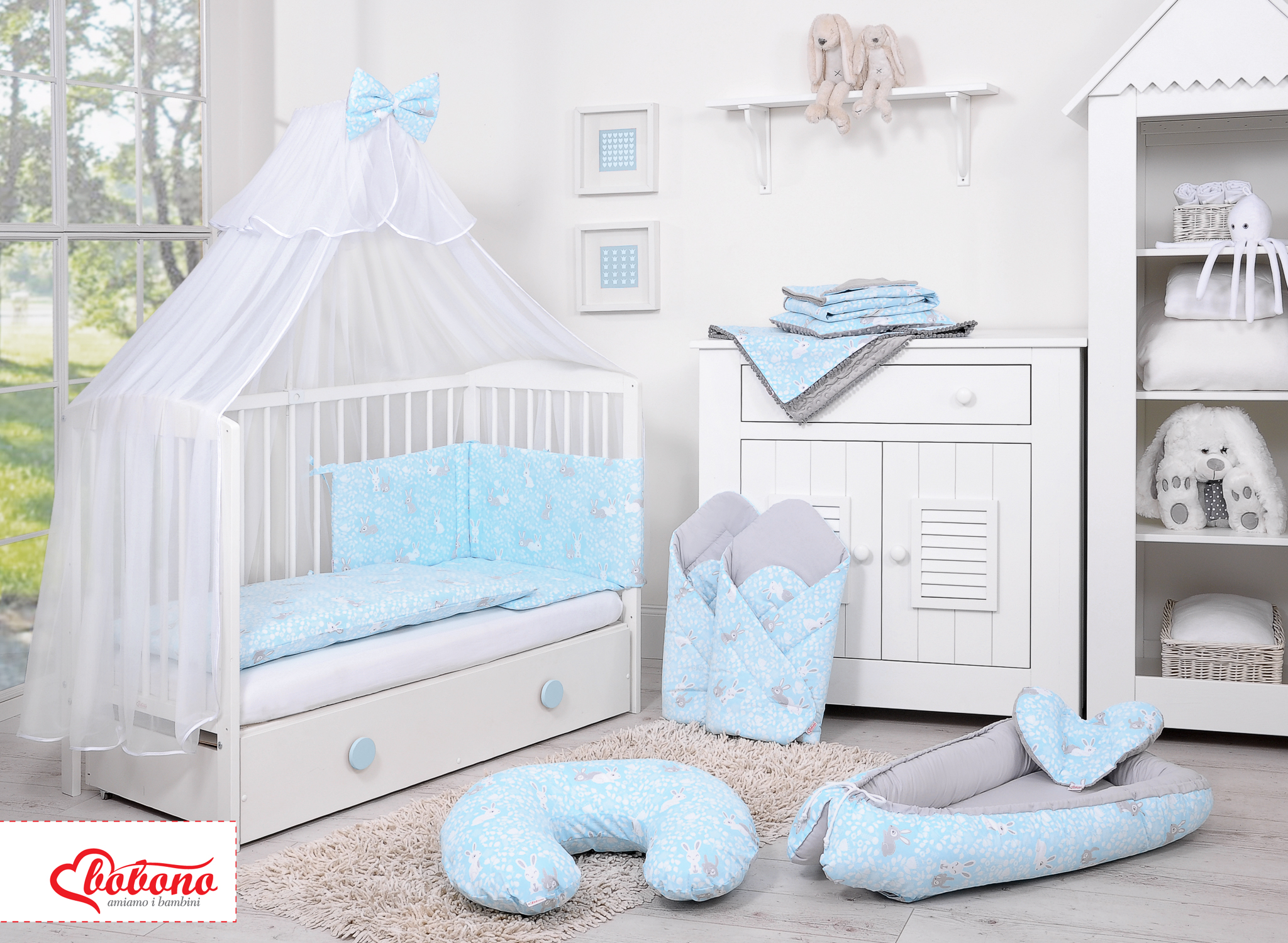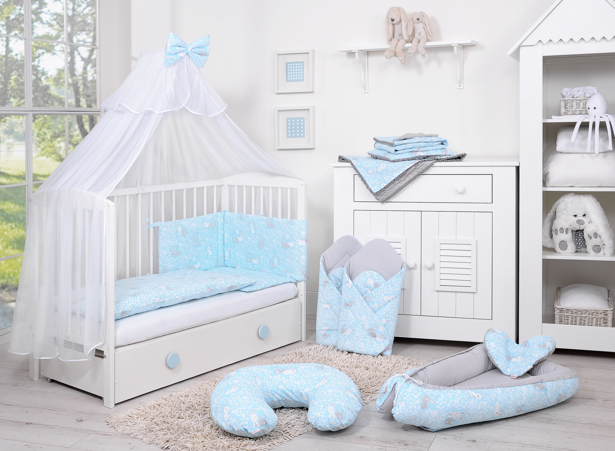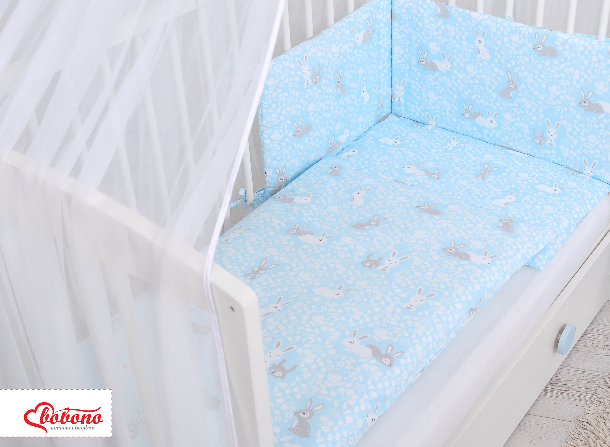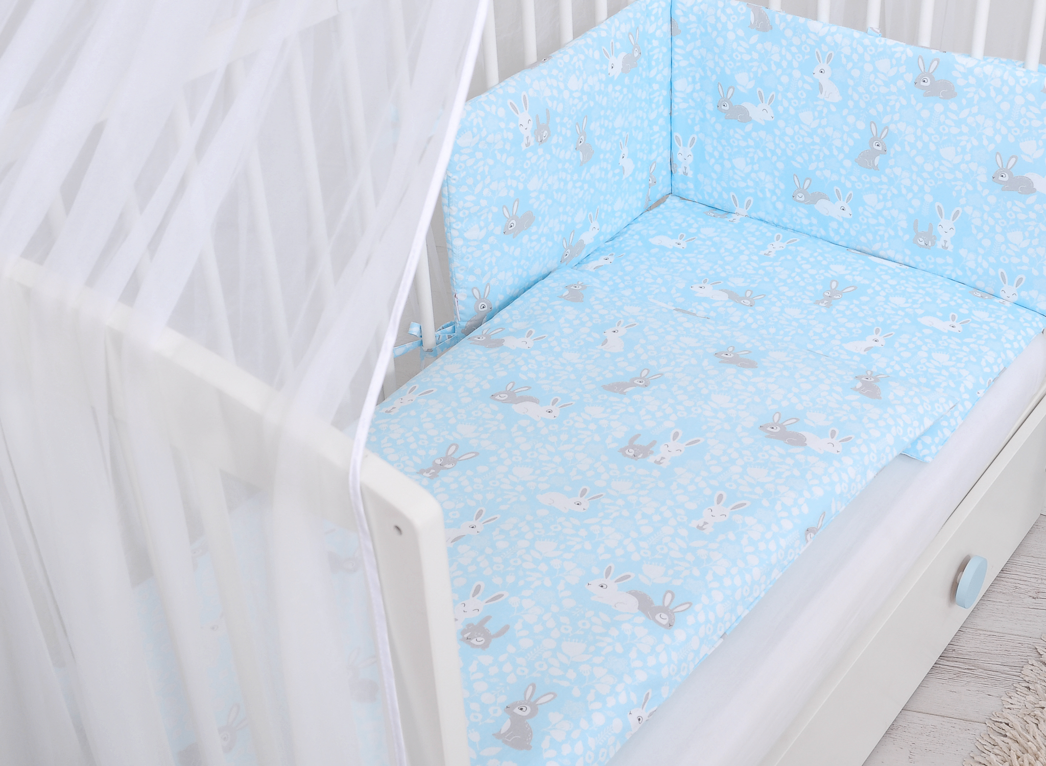 Stubenwagen » Bettwäsche für Babys » Bettwäsche für Babybett FUN & JOY » Bettwäsche Sets für Babybett 120cm » Bettwäsche Set 5-tlg mit Moskitonetz » Babybettwäsche Set 5-tlg mit Moskitonetz - blaue Hasen