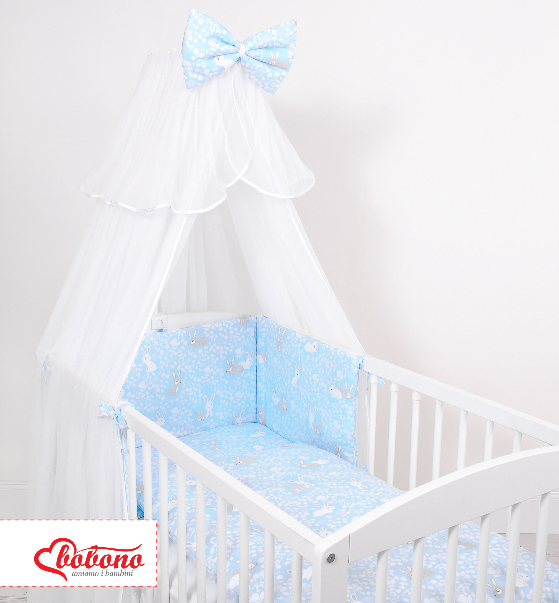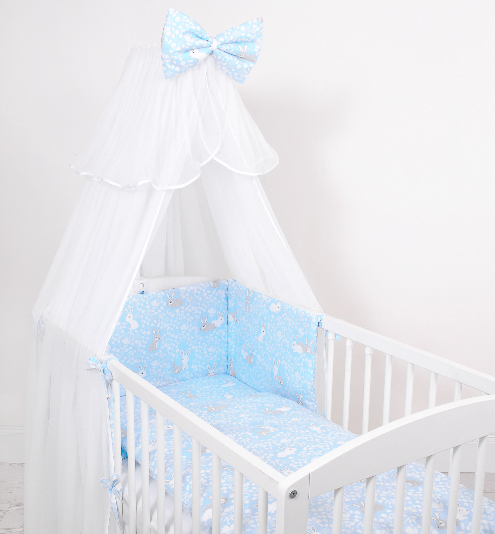 Babybettwäsche Set 5-tlg mit Moskitonetz - blaue Hasen