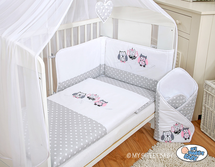 Babybettwäsche Set 5-tlg mit Moskitonetz - Eulen Bigi Zibi & Adele grau-pink