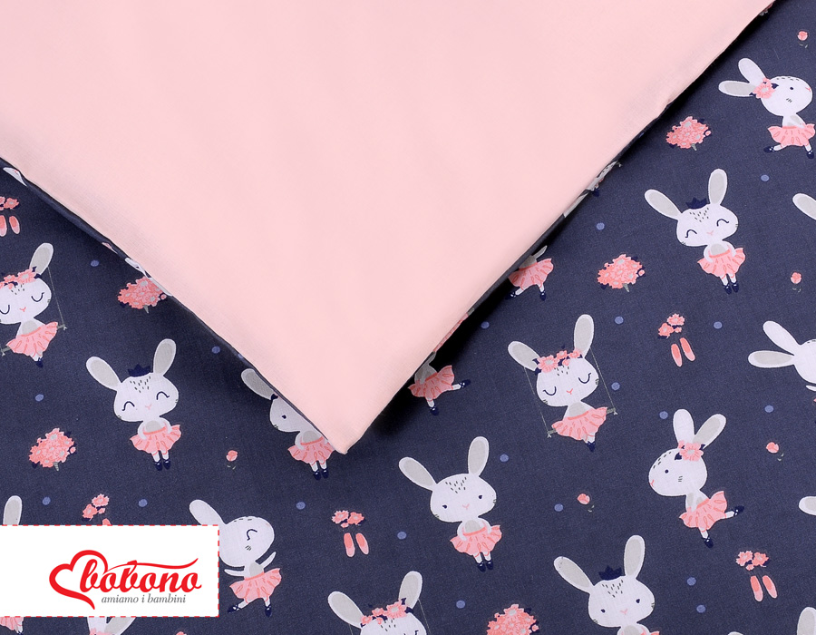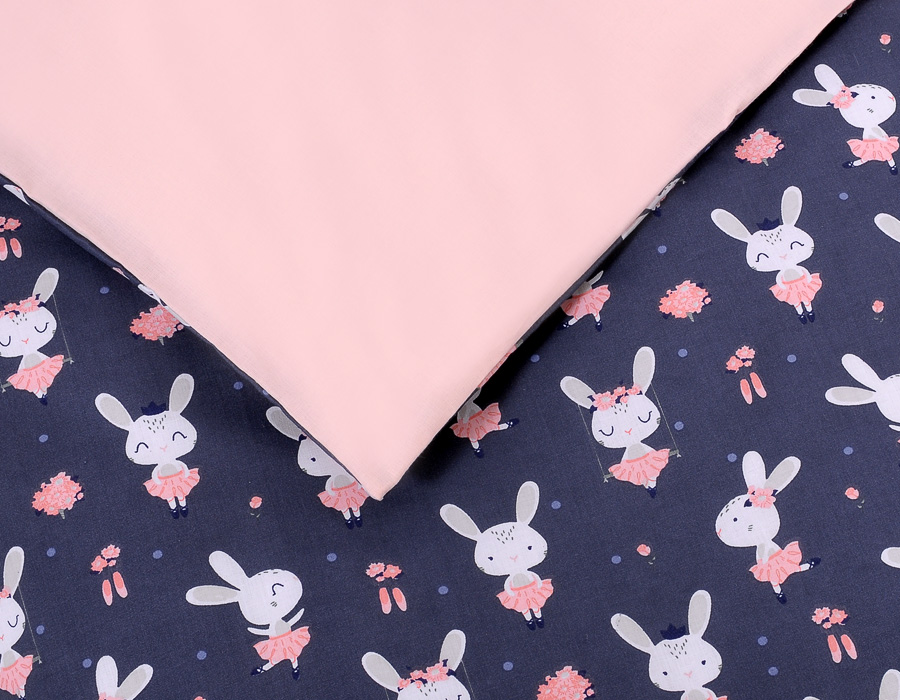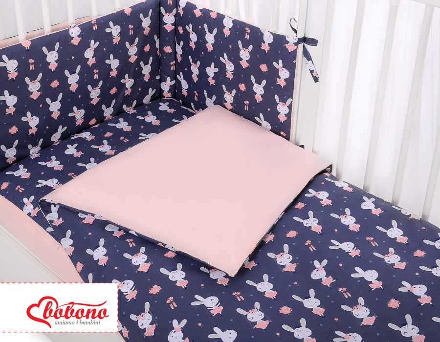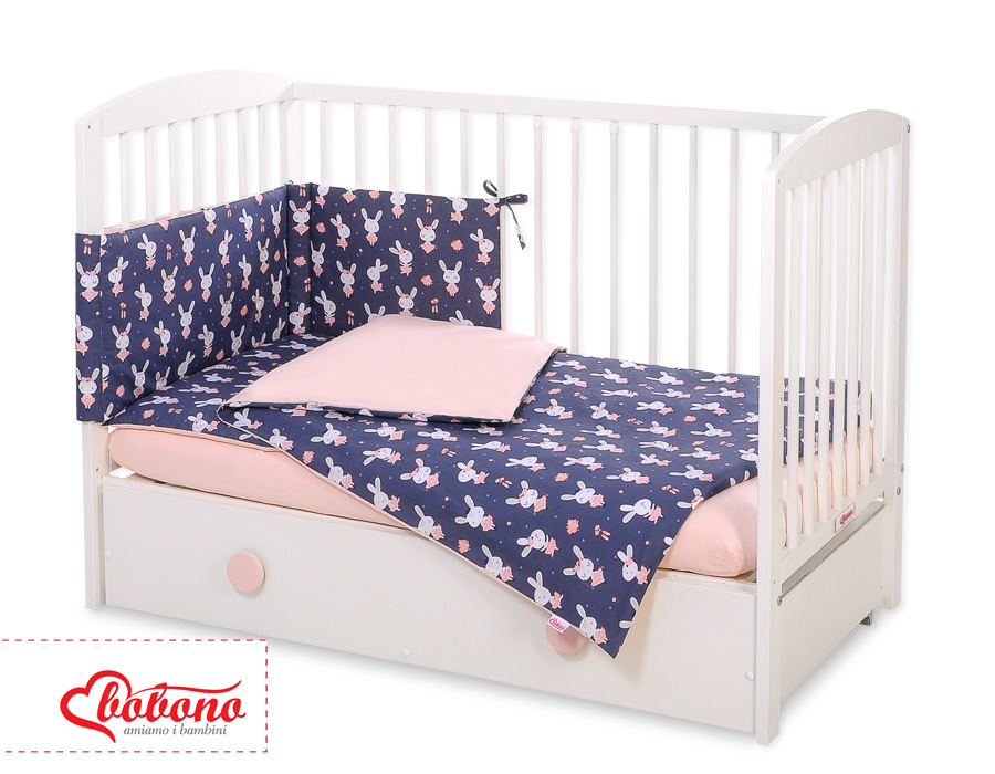 Stubenwagen » Bettwäsche für Babys » Bettwäsche für Babybett FUN & JOY » Bettwäsche Sets für Babybett 120cm » Bettwäsche Set 5-tlg mit Moskitonetz » Babybettwäsche Set 5-tlg mit Moskitonetz - Hasen dunkelblau