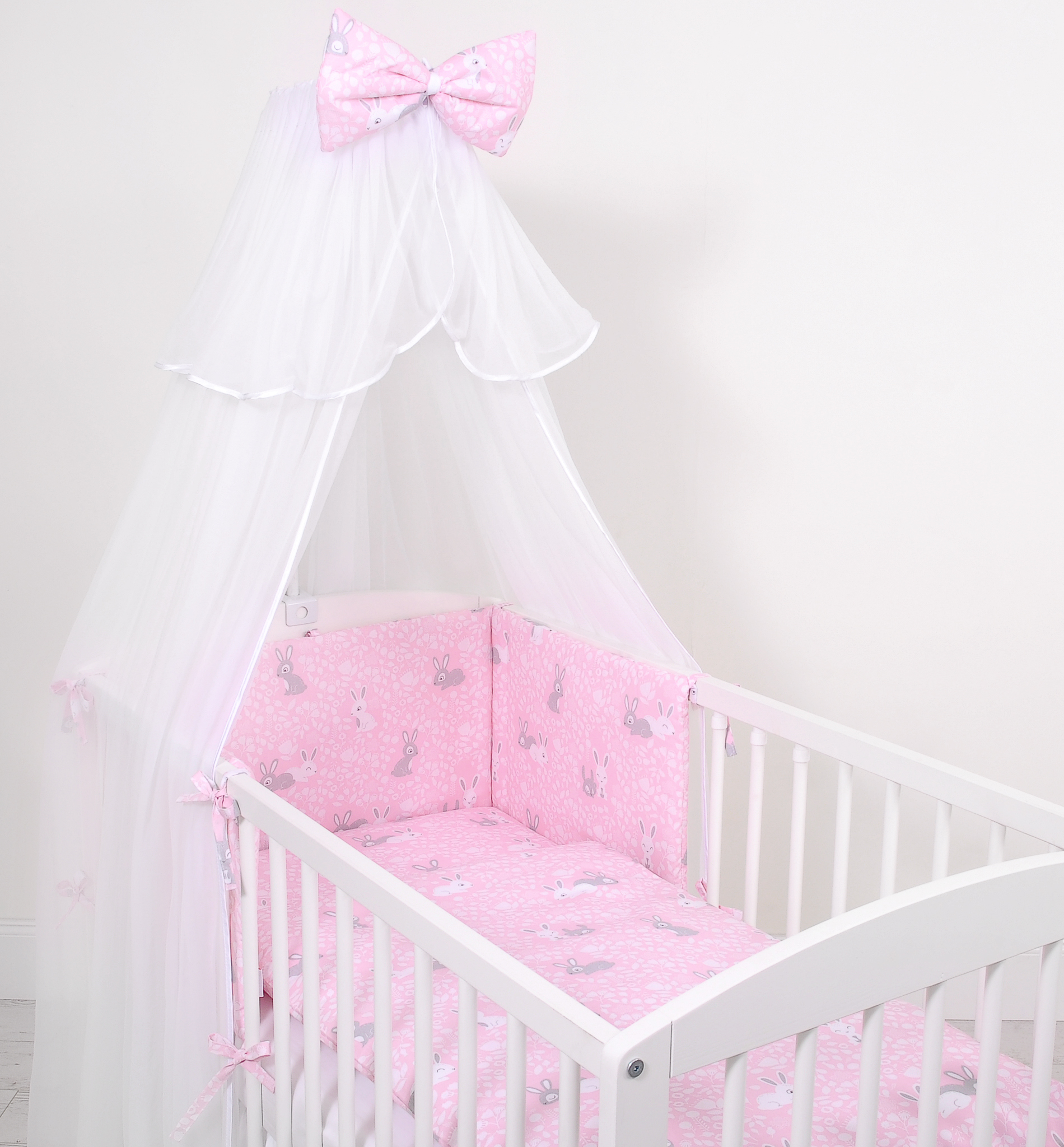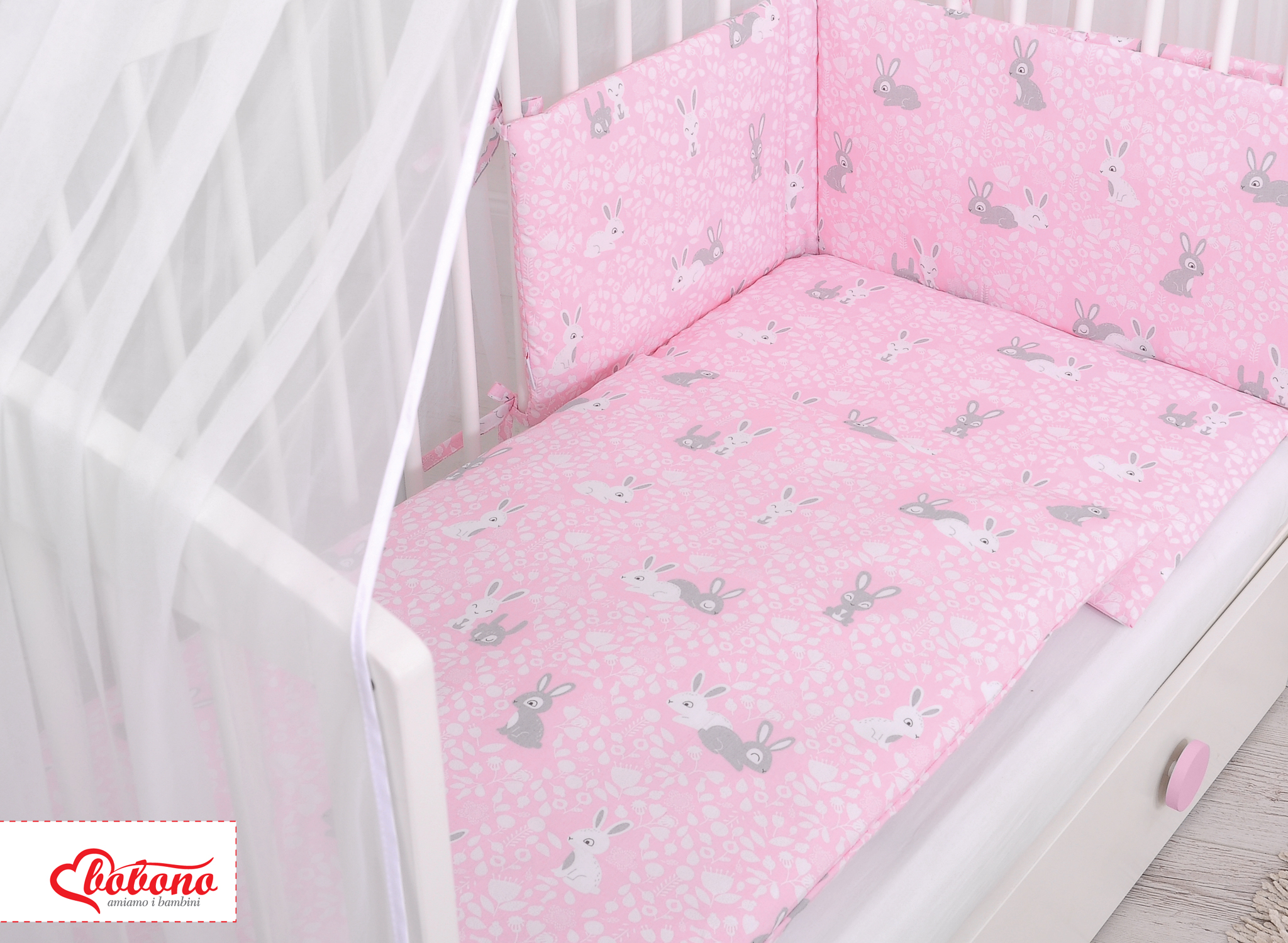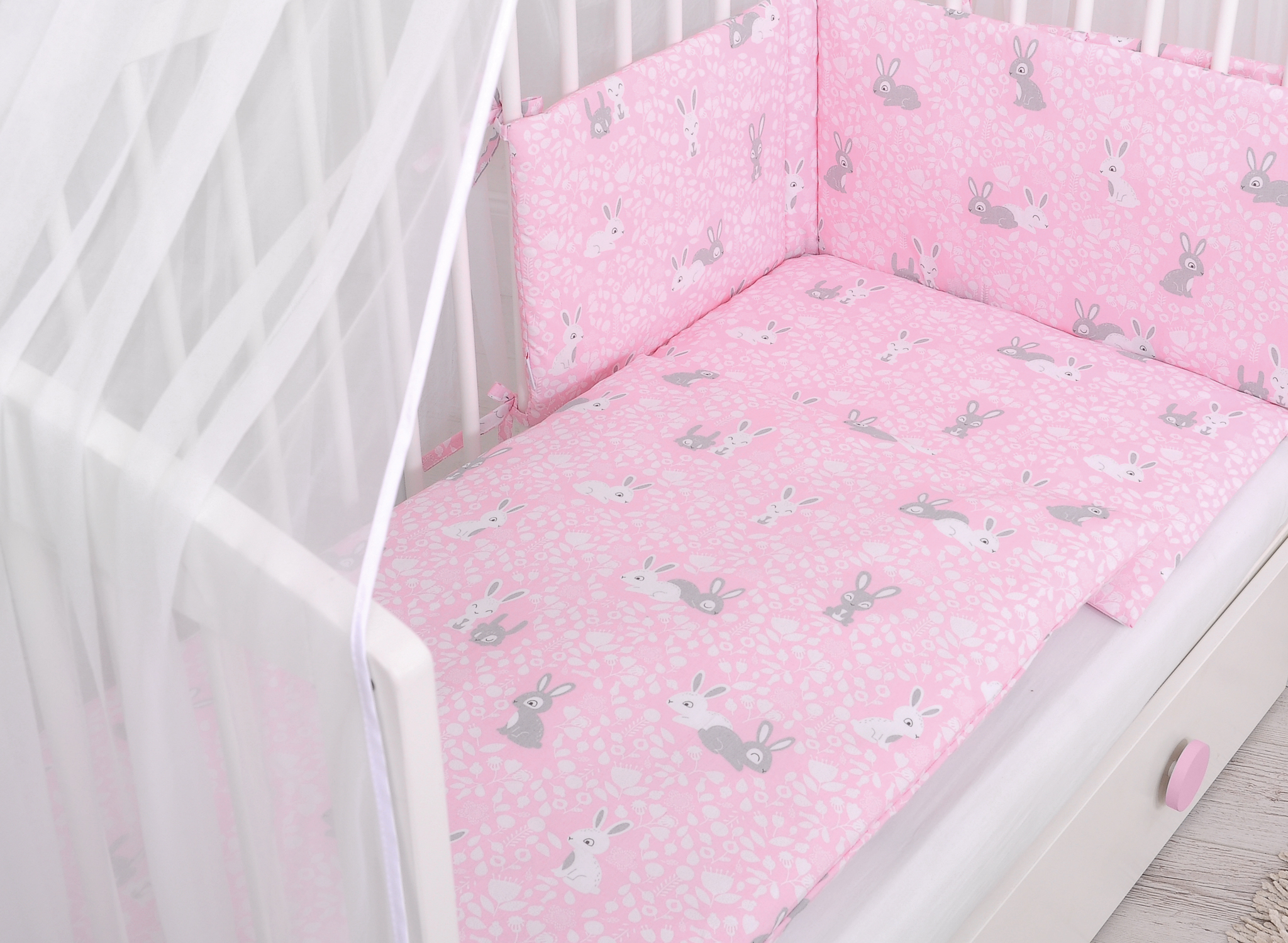 Stubenwagen » Bettwäsche für Babys » Bettwäsche für Babybett FUN & JOY » Bettwäsche Sets für Babybett 120cm » Bettwäsche Set 5-tlg mit Moskitonetz » Babybettwäsche Set 5-tlg mit Moskitonetz - rosa Hasen
