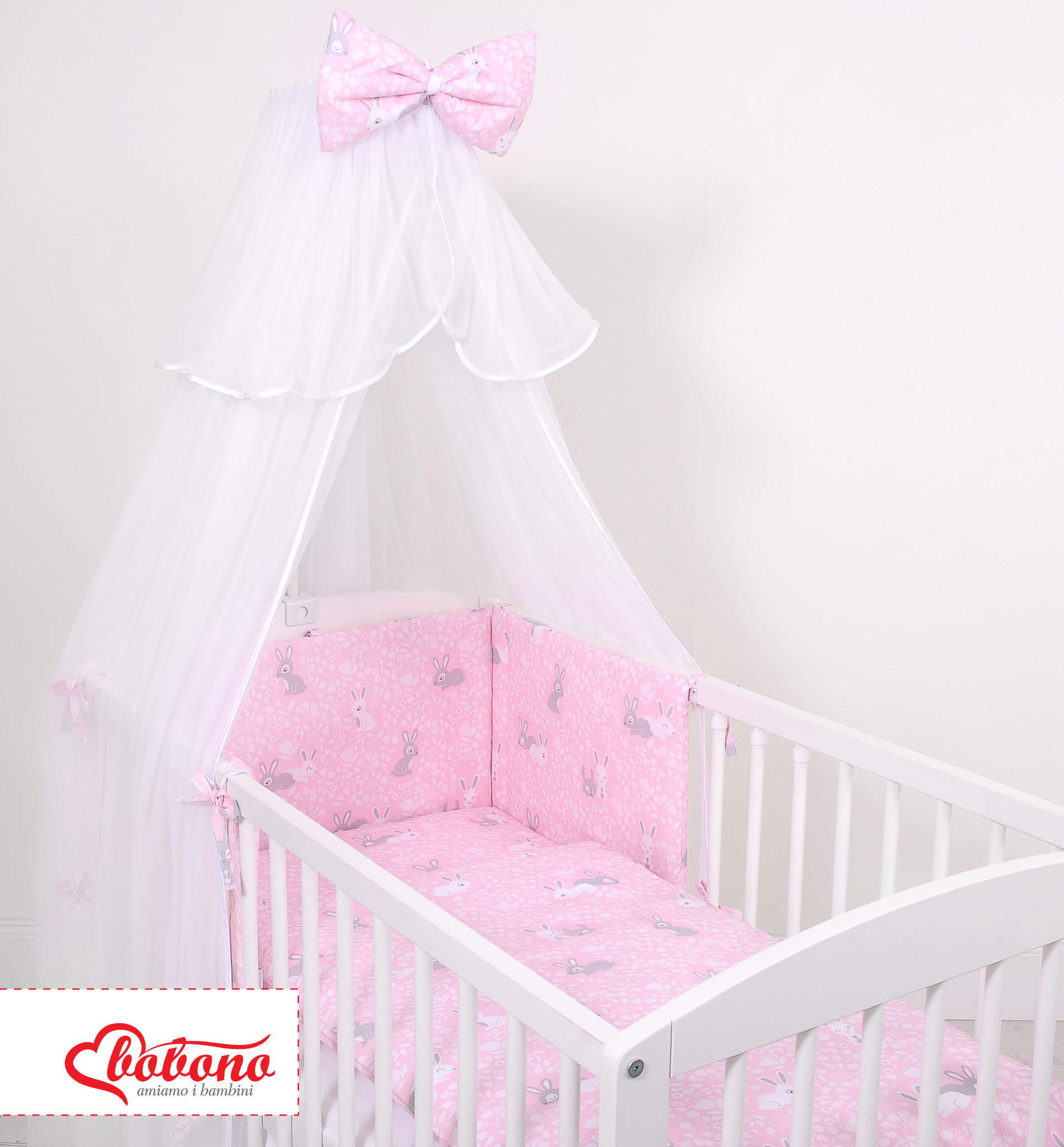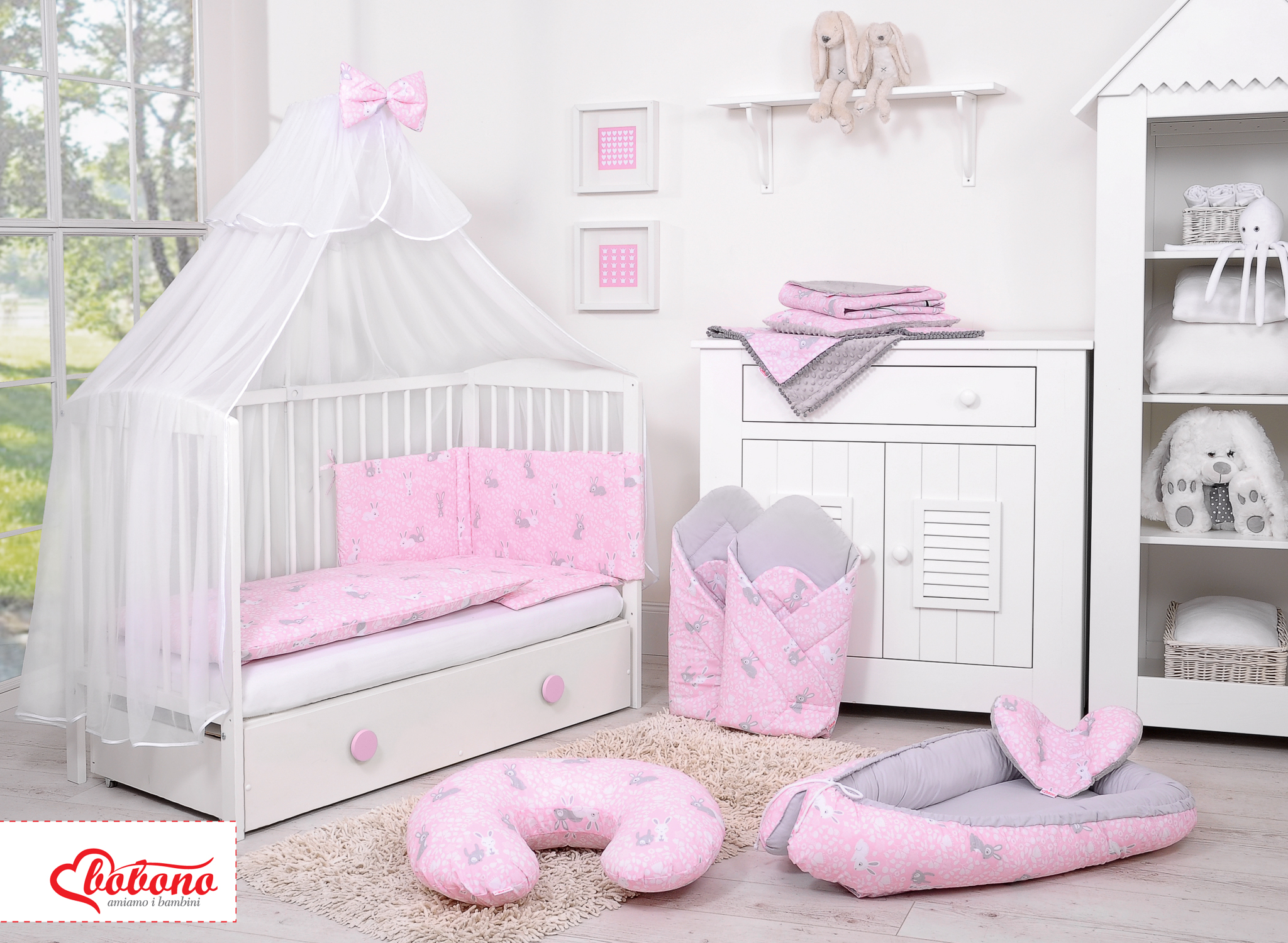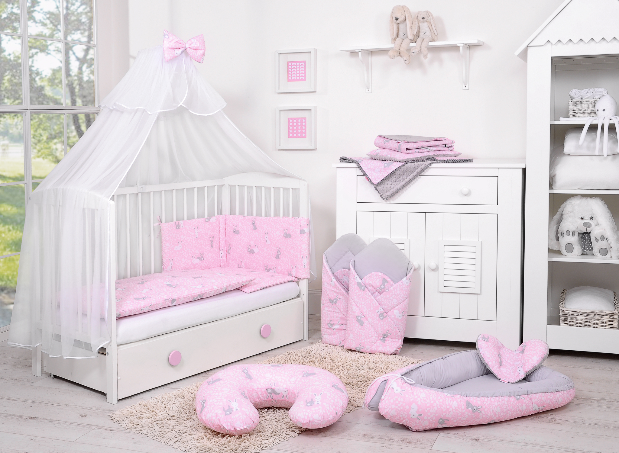 Stubenwagen » Bettwäsche für Babys » Bettwäsche für Babybett FUN & JOY » Bettwäsche Sets für Babybett 120cm » Bettwäsche Set 5-tlg mit Moskitonetz » Babybettwäsche Set 5-tlg mit Moskitonetz - rosa Hasen
