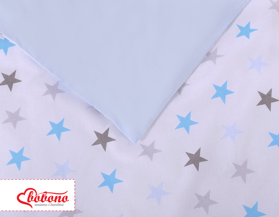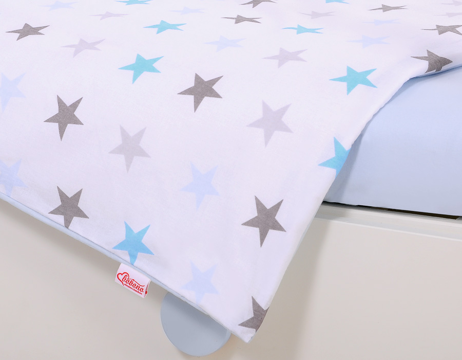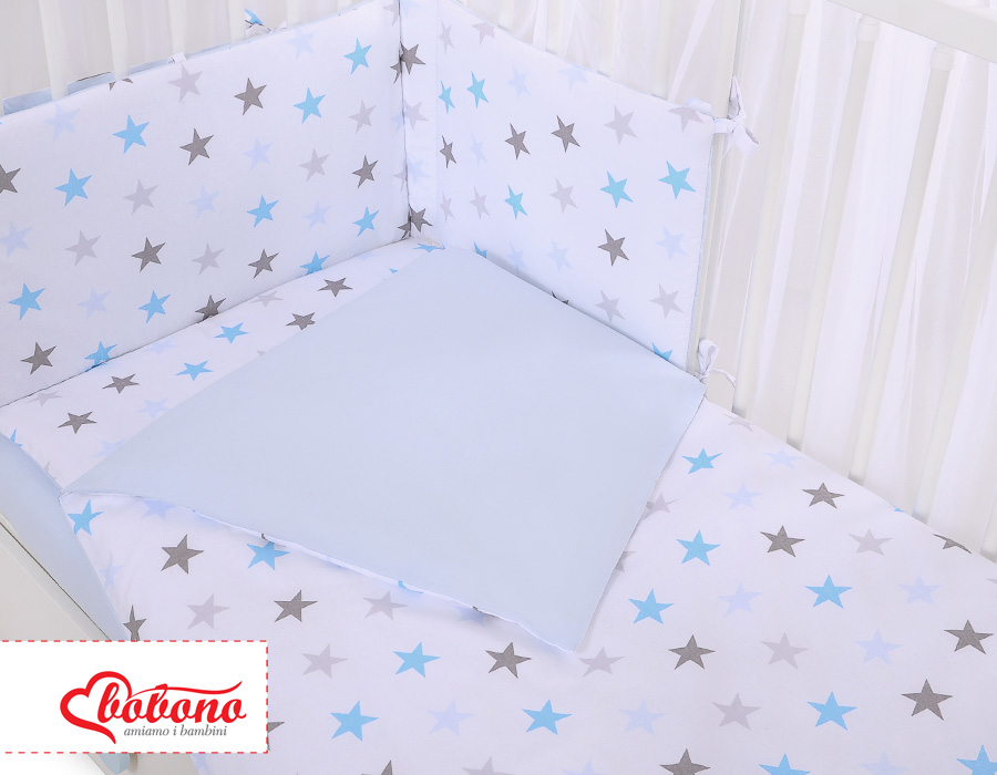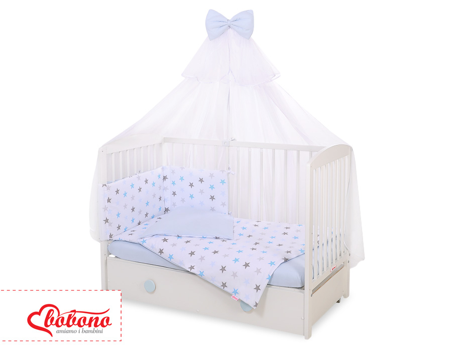 Stubenwagen » Bettwäsche für Babys » Bettwäsche für Babybett FUN & JOY » Bettwäsche Sets für Babybett 120cm » Bettwäsche Set 5-tlg mit Moskitonetz » Babybettwäsche Set 5-tlg mit Moskitonetz - Sternen grau -blau