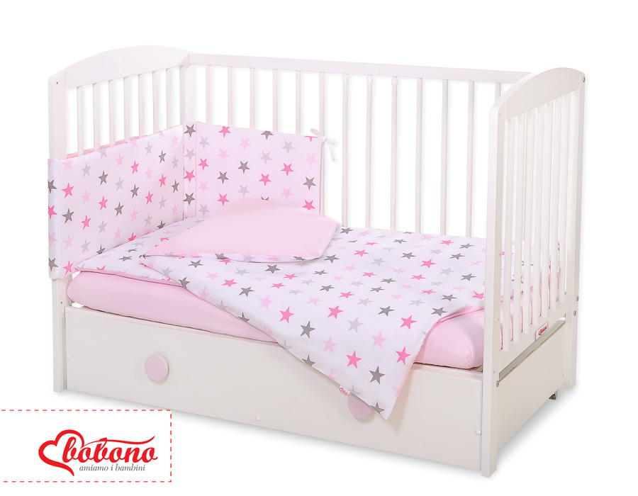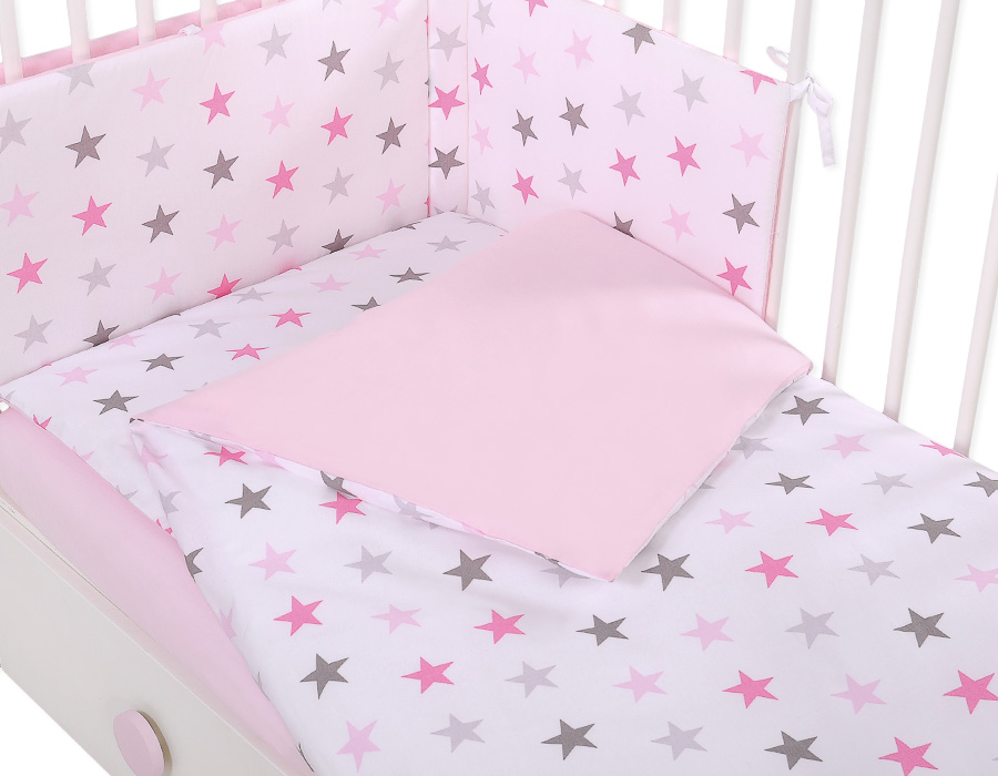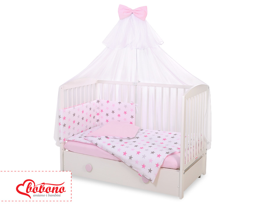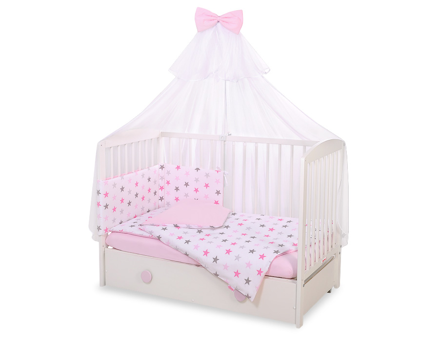Stubenwagen » Bettwäsche für Babys » Bettwäsche für Babybett FUN & JOY » Bettwäsche Sets für Babybett 120cm » Bettwäsche Set 5-tlg mit Moskitonetz » Babybettwäsche Set 5-tlg mit Moskitonetz - Sternen rosa - grau/ rosa