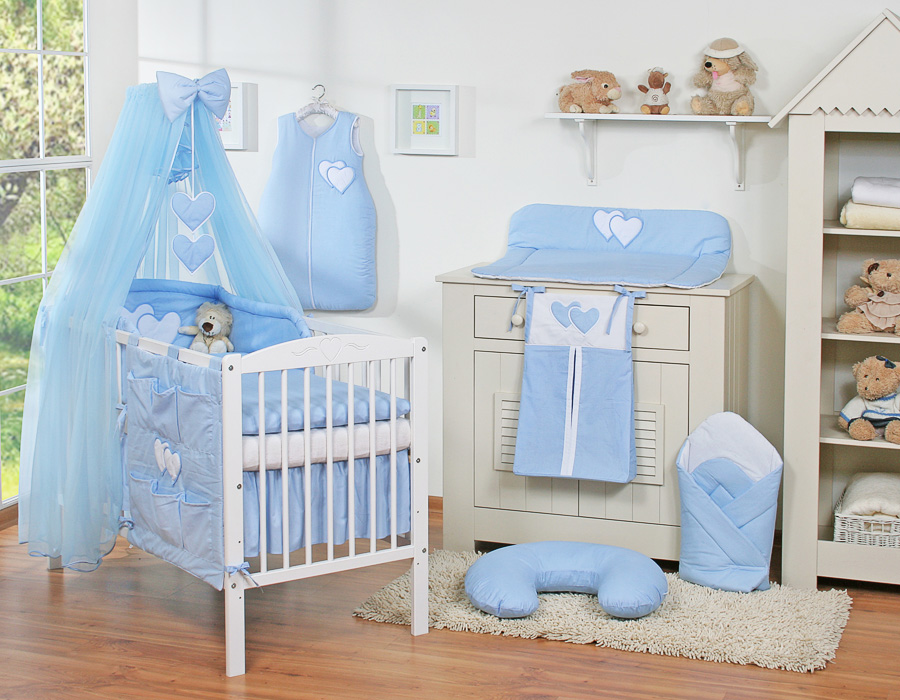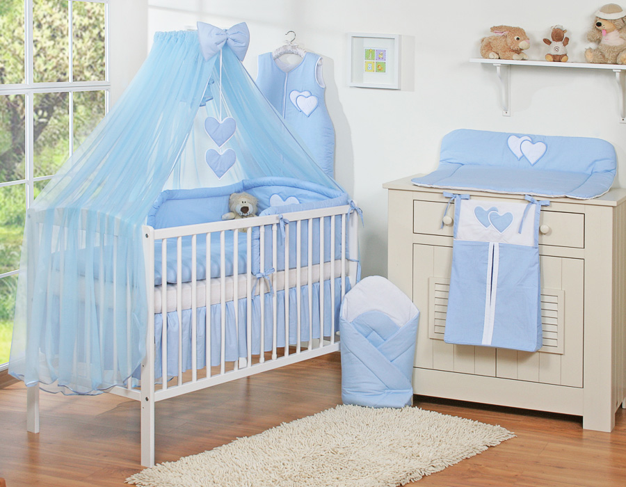Babybettwäsche-Set Blau 5-tlg mit Moskitonetz - Hängende Herzen