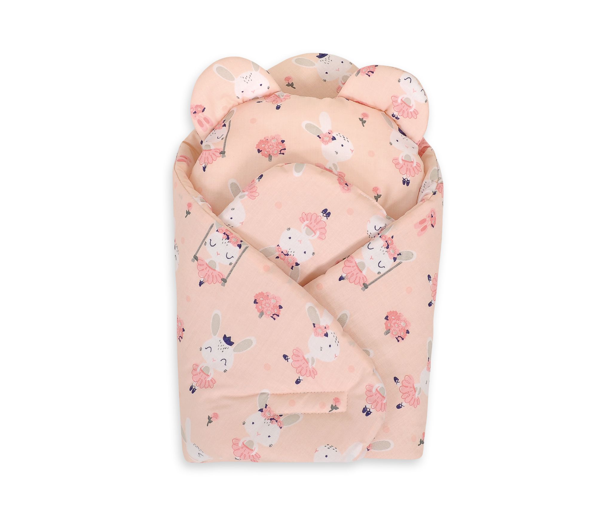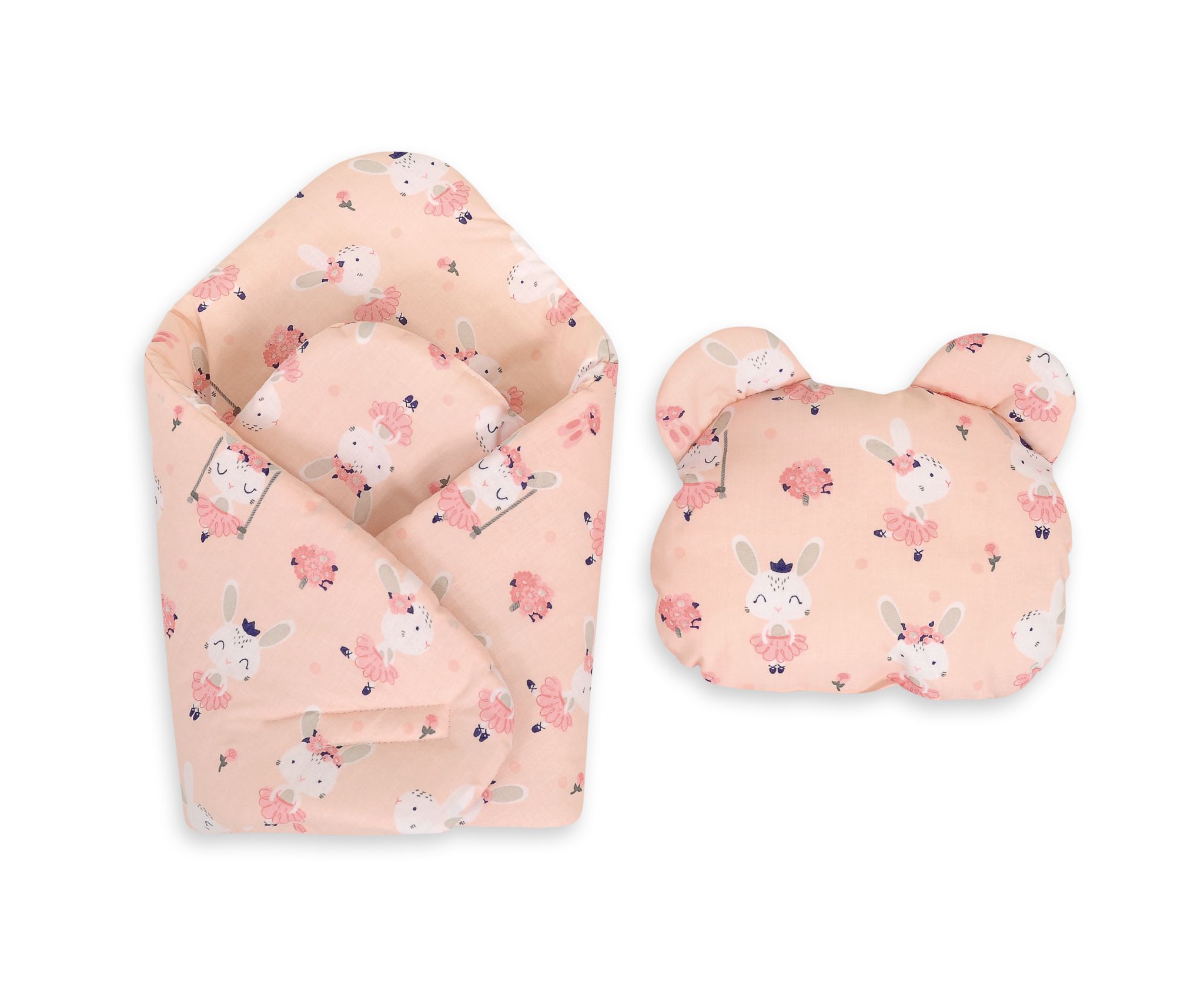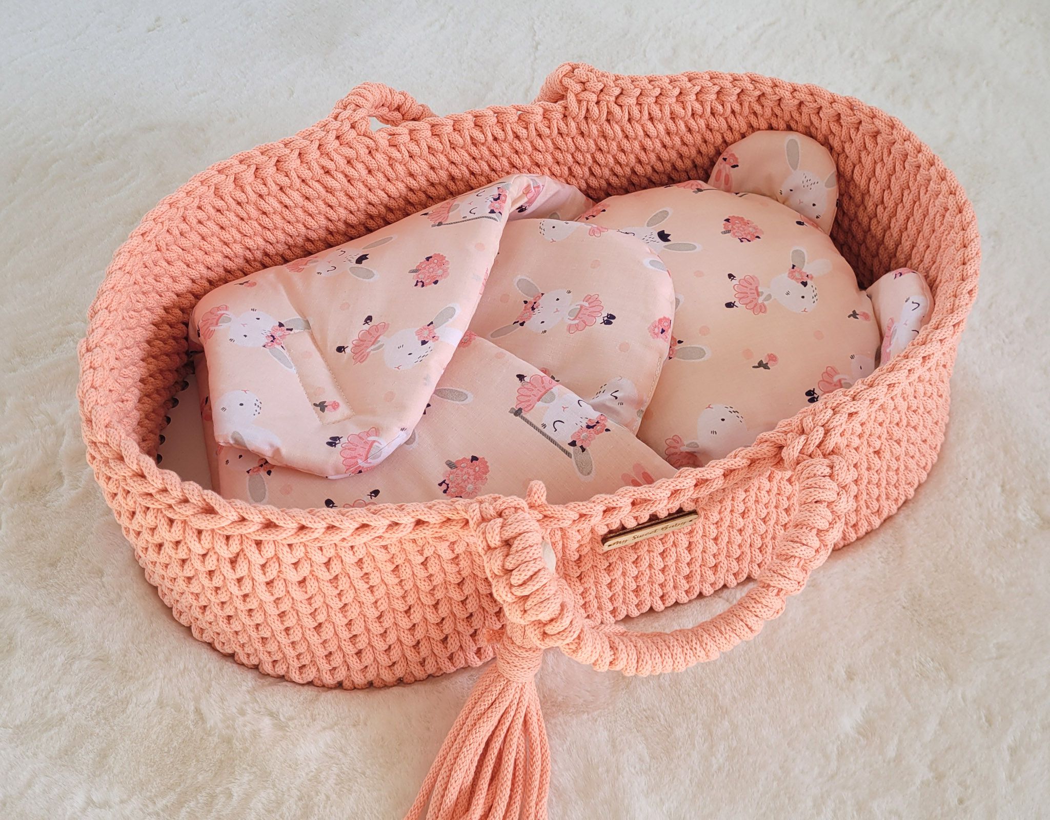 Zum Set gehört auch ein rundes Kissen mit Ohren in Form eines Teddybärkopfes. Ein bezauberndes Set für wunderbares Puppenspiel.