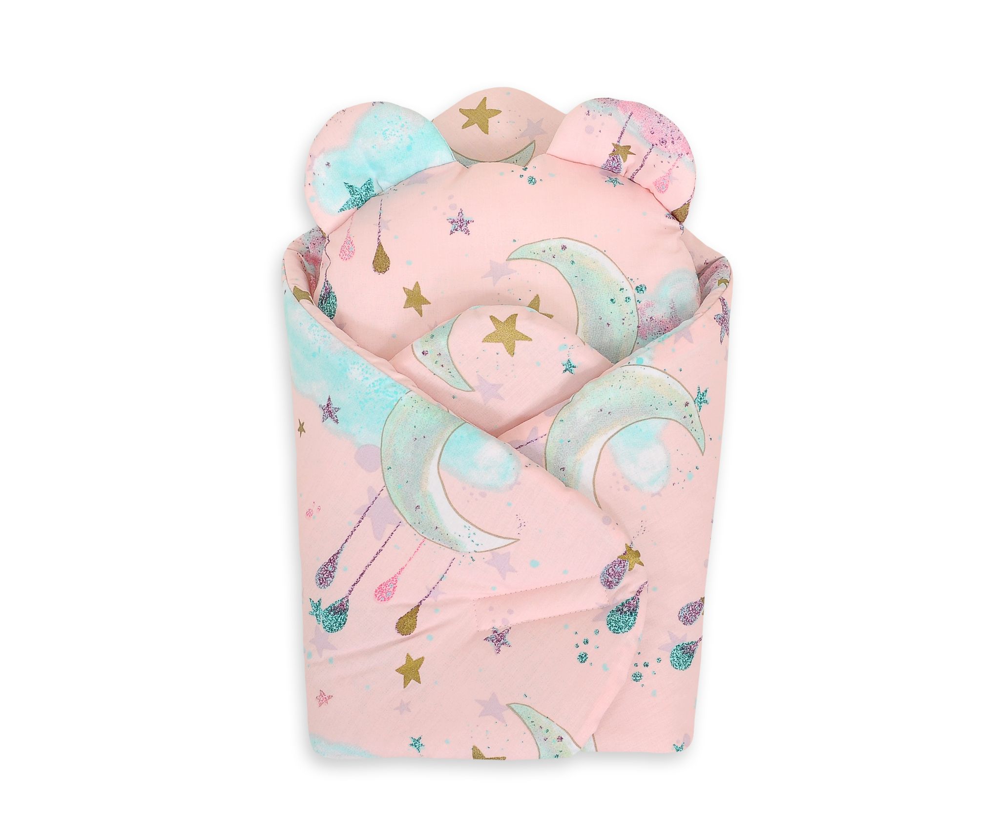 Zum Set gehört auch ein rundes Kissen mit Ohren in Form eines Teddybärkopfes. Ein bezauberndes Set für wunderbares Puppenspiel.