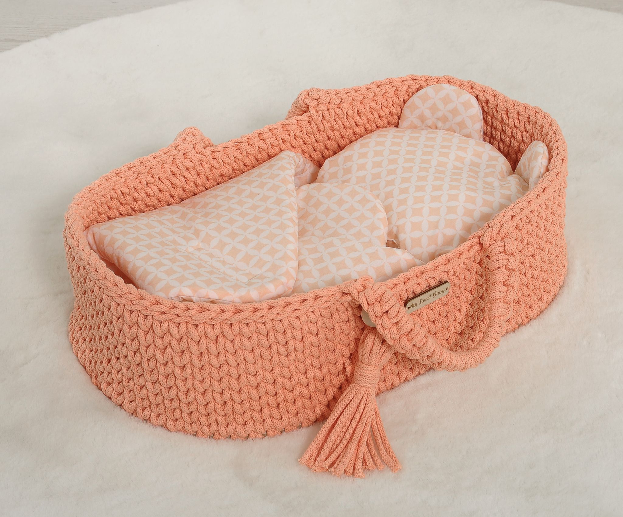 Babyhörnchen für Puppen mit Kissen - Rosette pfirsich