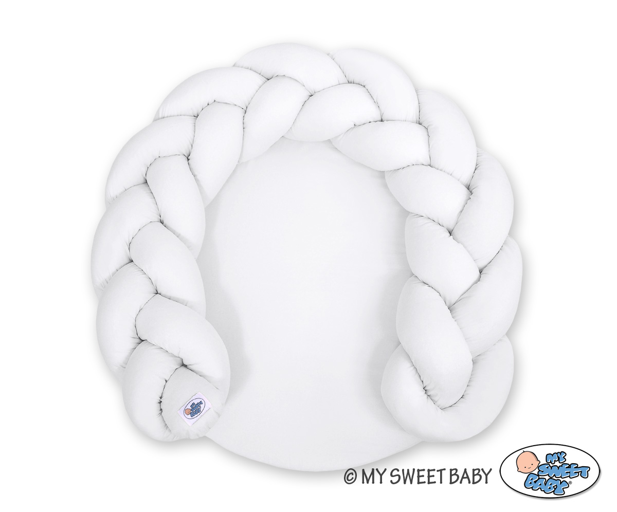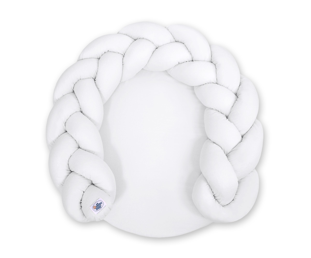Ohne die Unterlage kann der Zopf als Nestchen im Kinderbett genutzt werden. Die Länge des Zopfes beträgt 180 cm. Das Nestchen kann im Kinderbett als Schutz dienen und später in das größere Bettchen umziehen. Es kann auch wunderbar als Deko im Kinderzimmer dienen.