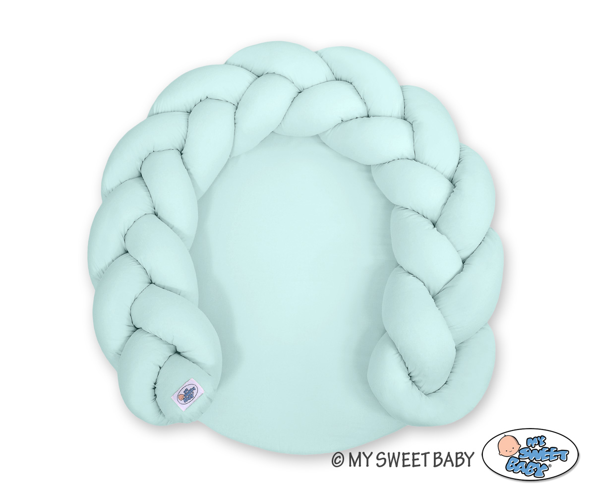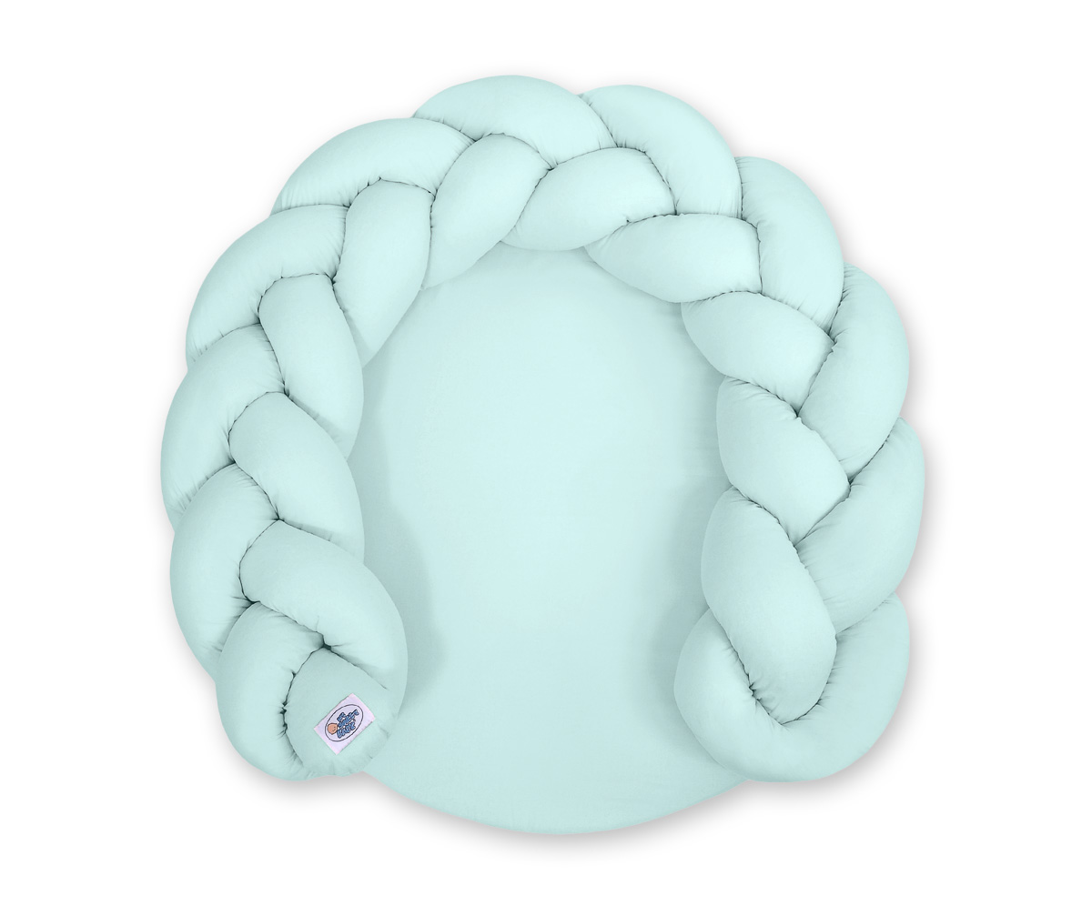 Ohne die Unterlage kann der Zopf als Nestchen im Kinderbett genutzt werden. Die Länge des Zopfes beträgt 180 cm. Das Nestchen kann im Kinderbett als Schutz dienen und später in das größere Bettchen umziehen. Es kann auch wunderbar als Deko im Kinderzimmer dienen.