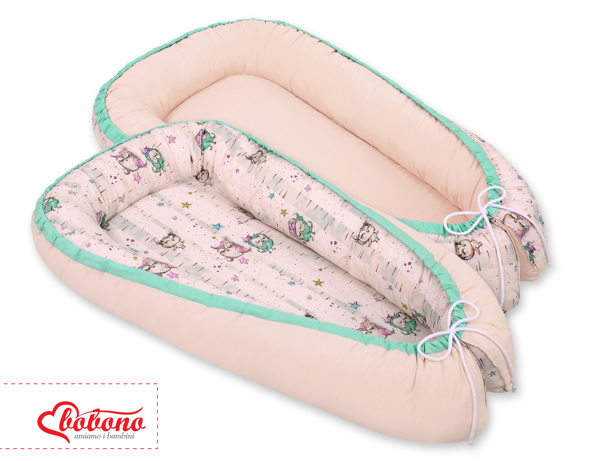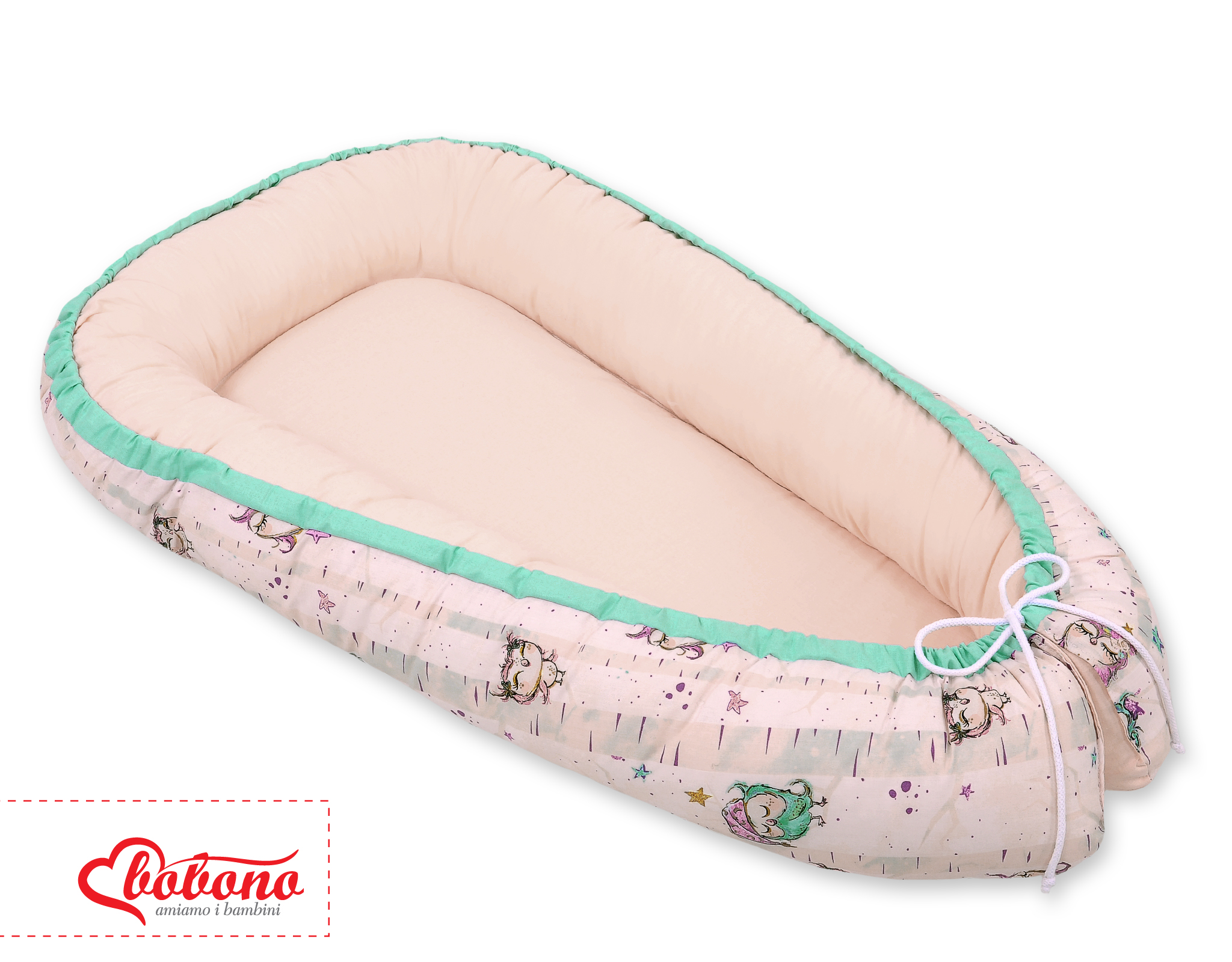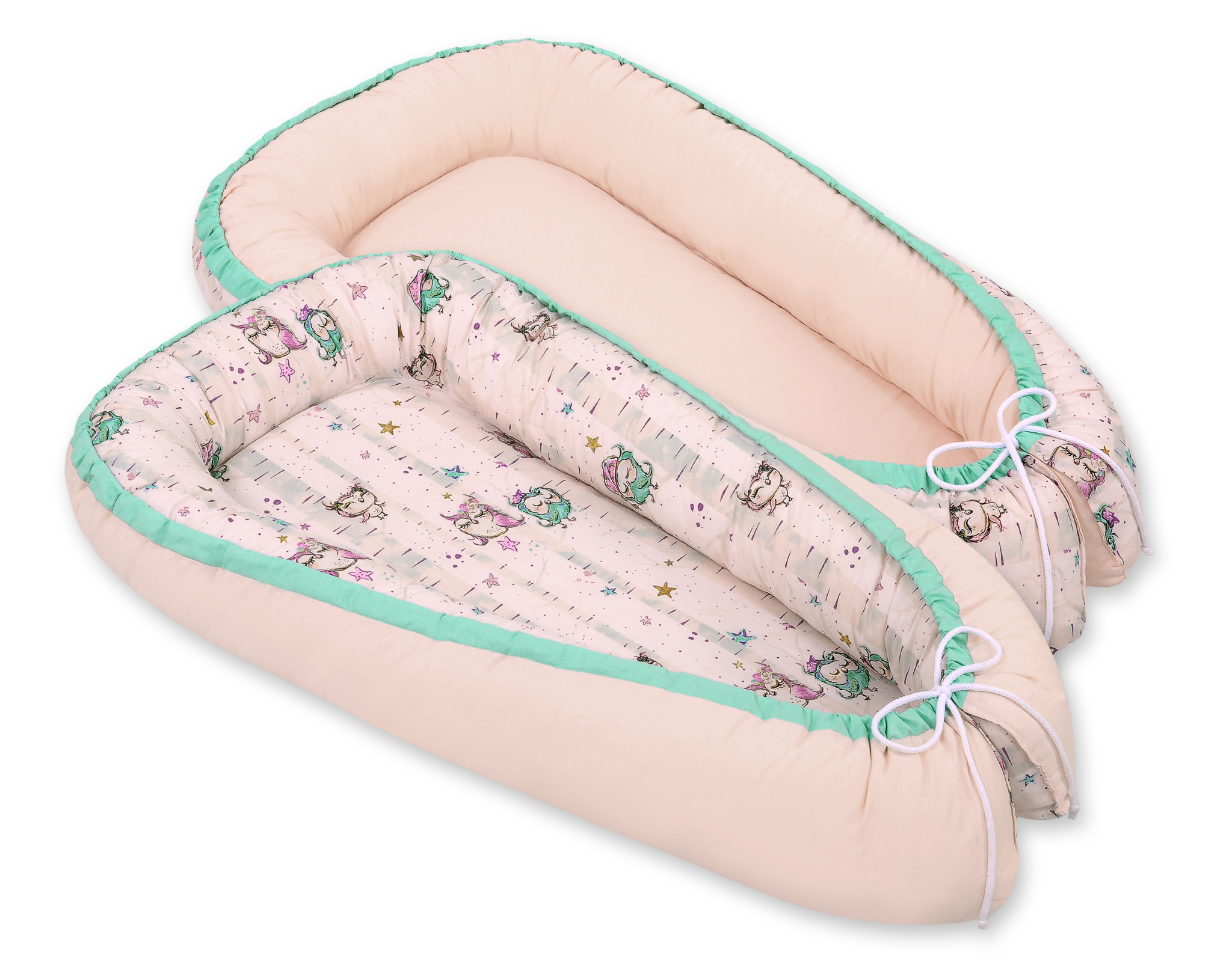 Das Nestchen ist doppelseitig und aus 100% Baumwolle gefertigt. Der Stoff hat eine zarte Vergoldung, die ihm noch mehr märchenhaften Charakter verleiht. Als Füllung verwenden wir Eco-Fillball Gewebe. Das ist weiches Poliestergewebe in kleine Kügelchen geformmt. Sie sind weich, federnd und luftdurchlässig. An der Unterseite ist eine herausnehmbare Matratze aus Vlies. Alle Materialien sind getestet und für Neugeborene zugelassen.