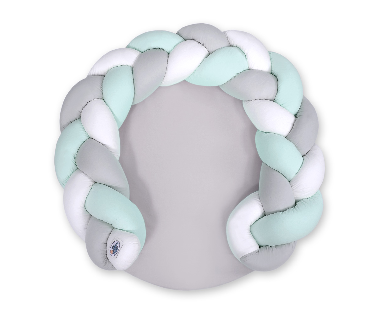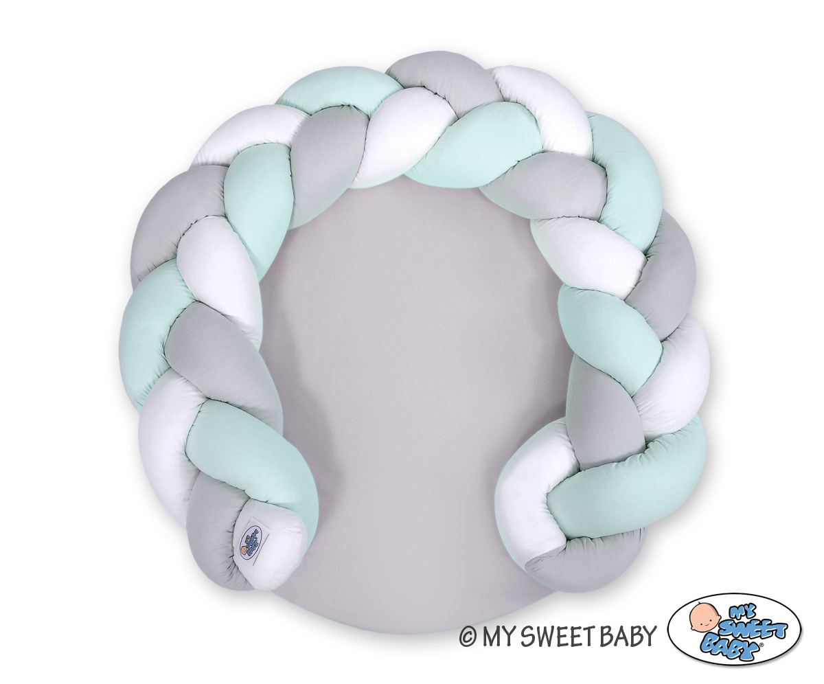 Ohne die Unterlage kann der Zopf als Nestchen im Kinderbett genutzt werden. Die Länge des Zopfes beträgt 180 cm. Das Nestchen kann im Kinderbett als Schutz dienen und später in das größere Bettchen umziehen. Es kann auch wunderbar als Deko im Kinderzimmer dienen.