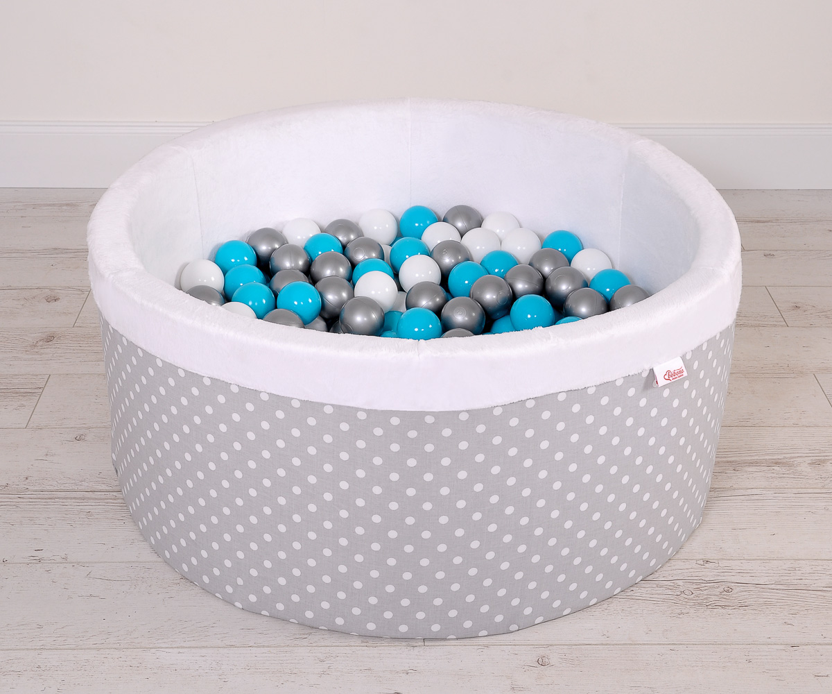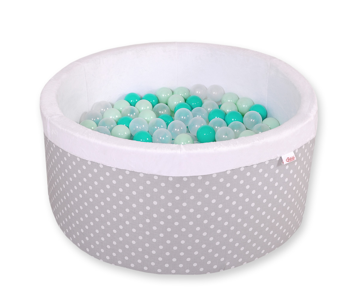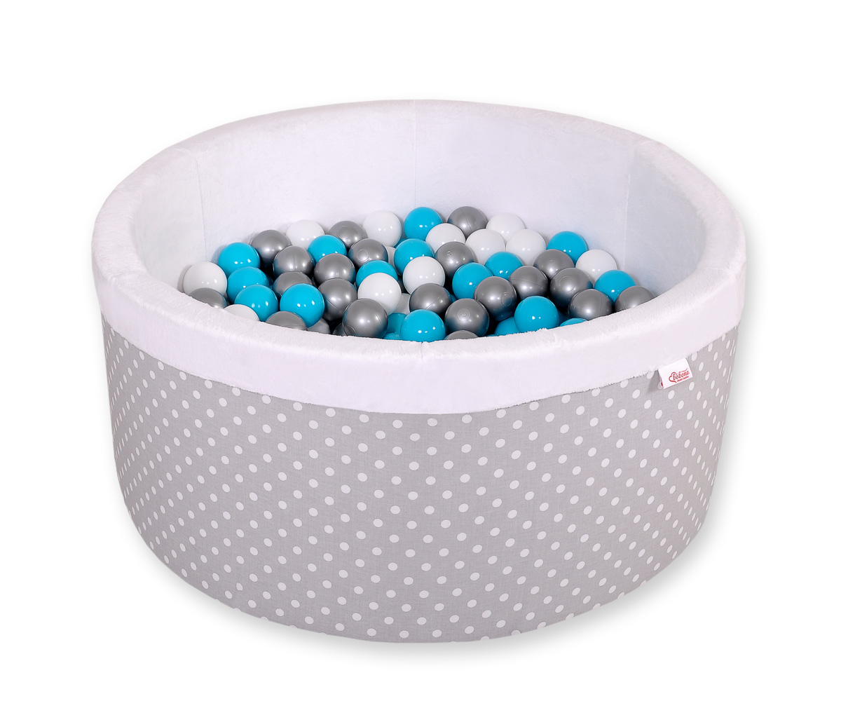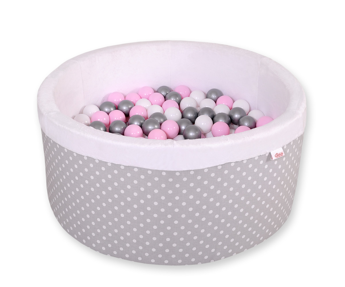 Bällebad aus Minkystoff mit Bällen 200st - Grau-Punktemuster Das bunte Bällebad eignet sich hervorragend um darin Draußen und in Haus zu spielen. Die bunten Bälle sind entwicklungsfördernd für das Kind. Der Pool ist aus weichem Schaumstoff gefertigt, bietet dadurch viel Sicherheit beim spielen.