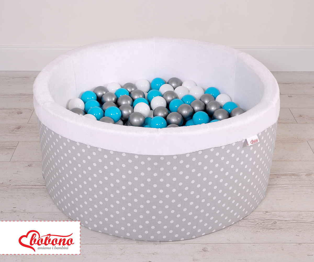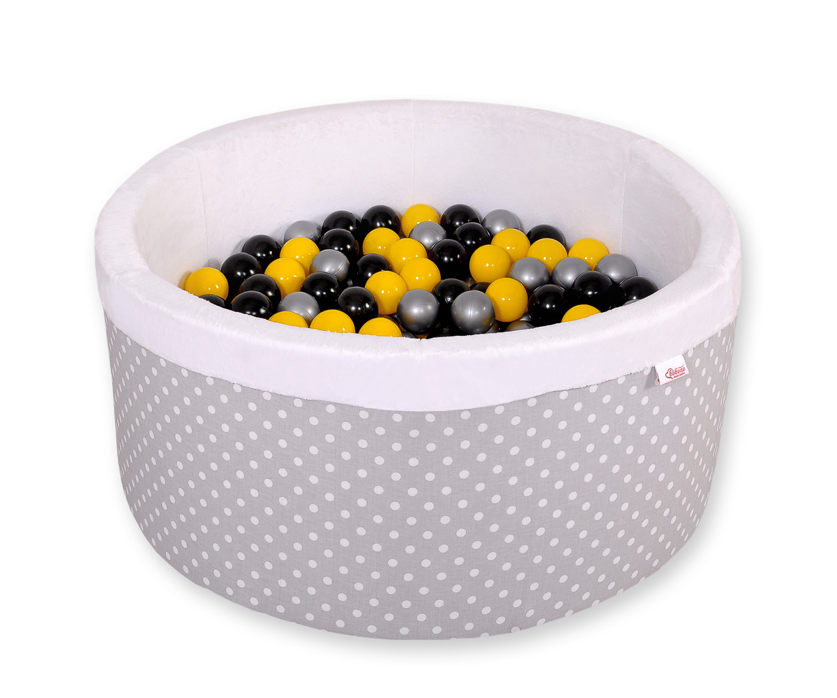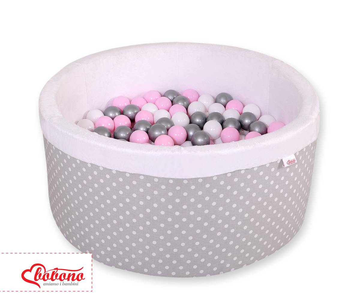 Bällebad aus Minkystoff mit Bällen 200st - Grau-Punktemuster Das bunte Bällebad eignet sich hervorragend um darin Draußen und in Haus zu spielen. Die bunten Bälle sind entwicklungsfördernd für das Kind. Der Pool ist aus weichem Schaumstoff gefertigt, bietet dadurch viel Sicherheit beim spielen.