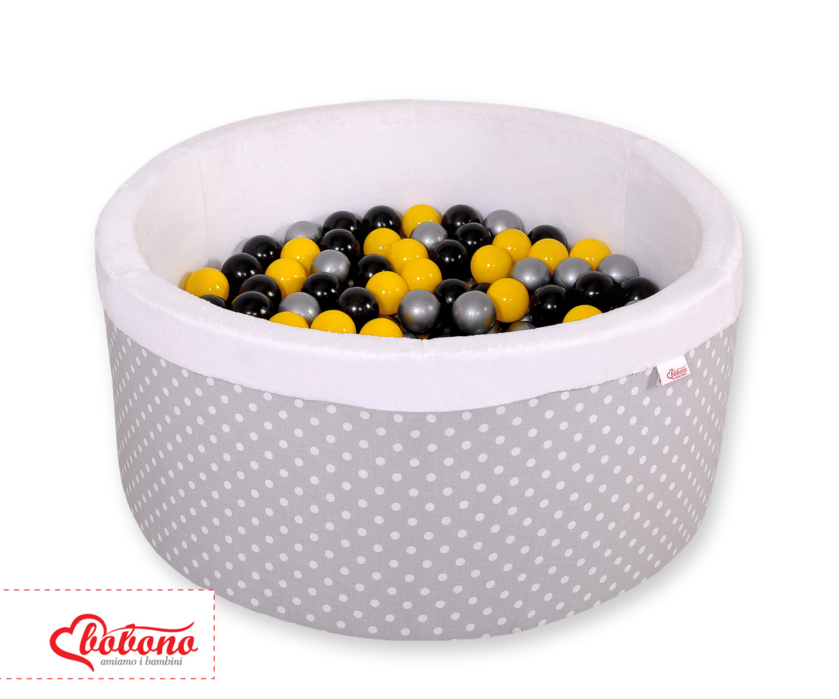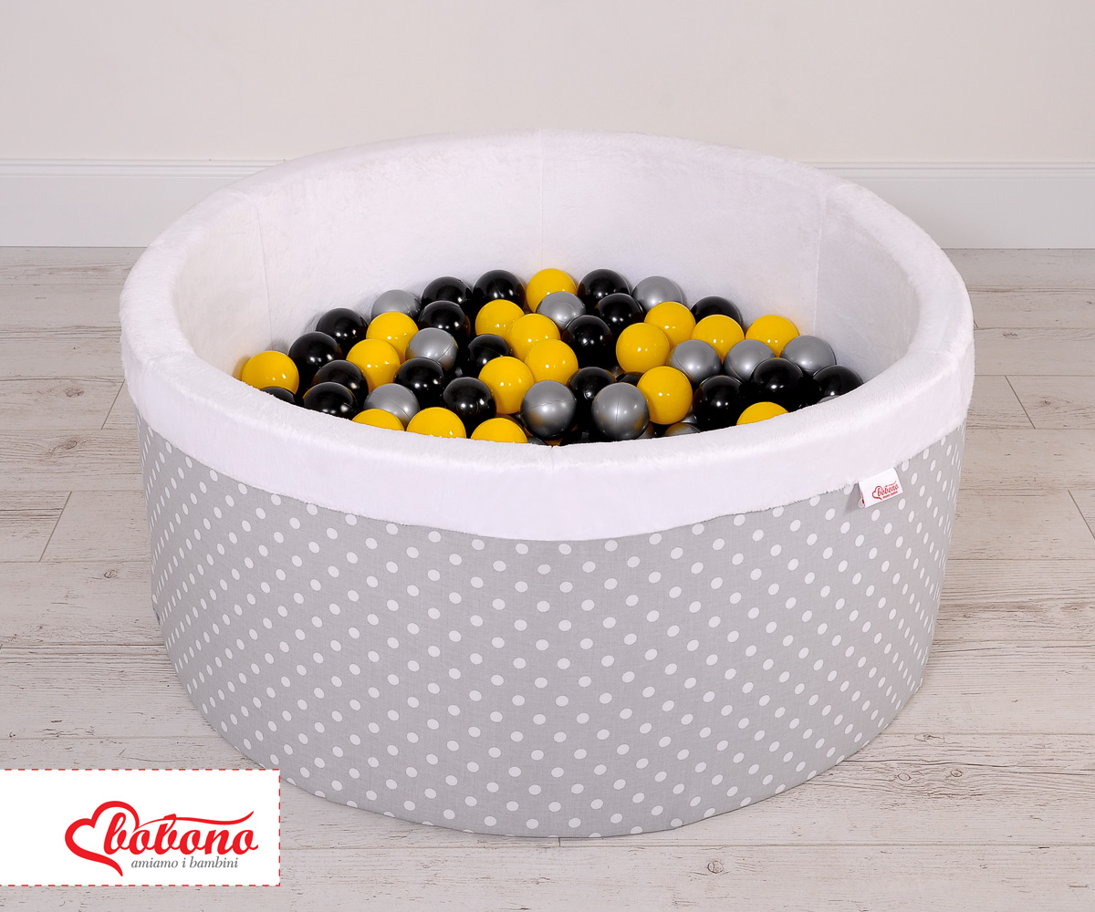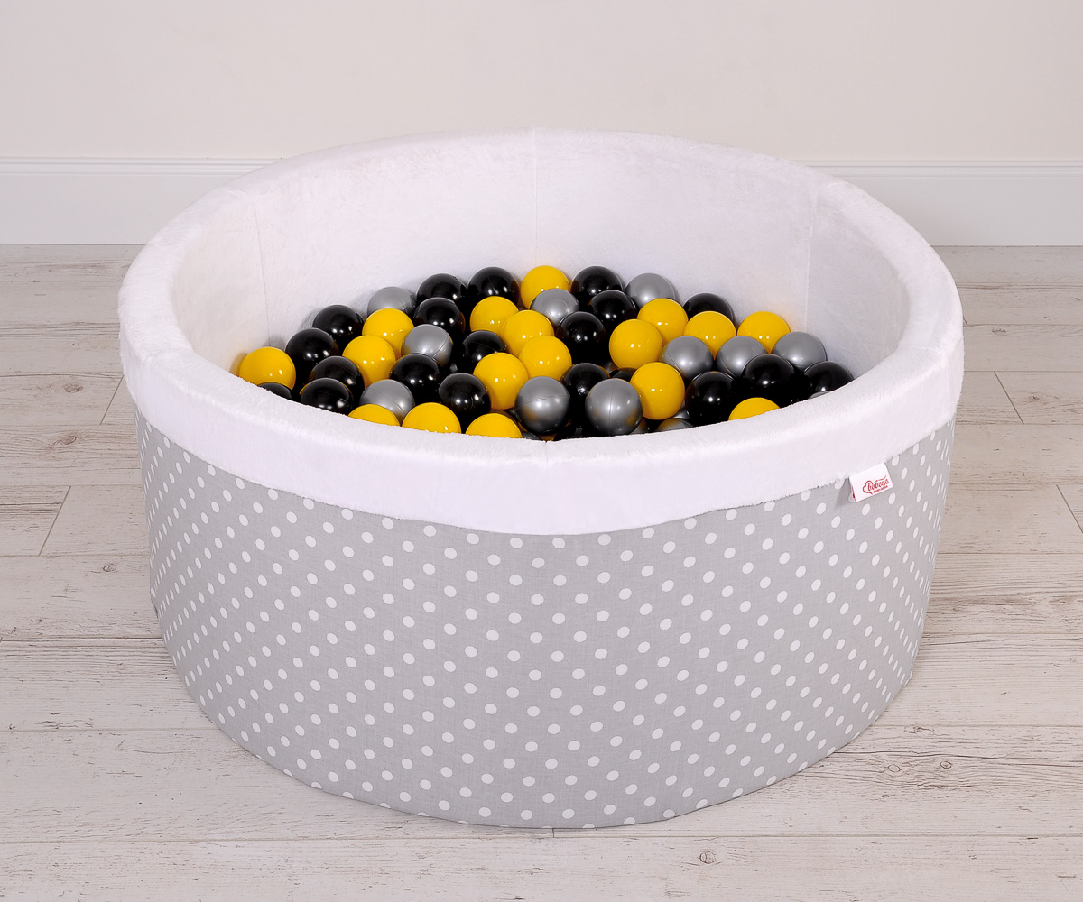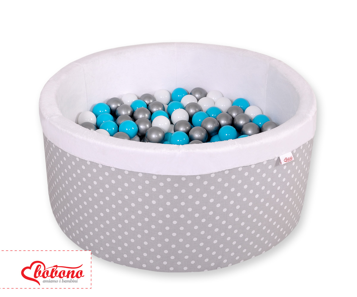 Bällebad aus Minkystoff mit Bällen 200st - Grau-Punktemuster Das bunte Bällebad eignet sich hervorragend um darin Draußen und in Haus zu spielen. Die bunten Bälle sind entwicklungsfördernd für das Kind. Der Pool ist aus weichem Schaumstoff gefertigt, bietet dadurch viel Sicherheit beim spielen.