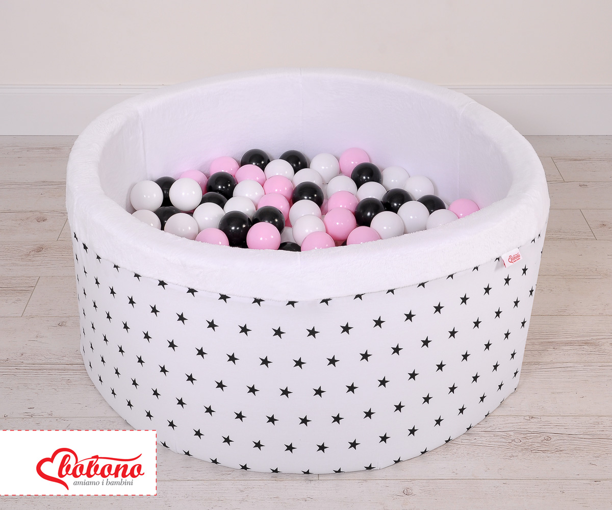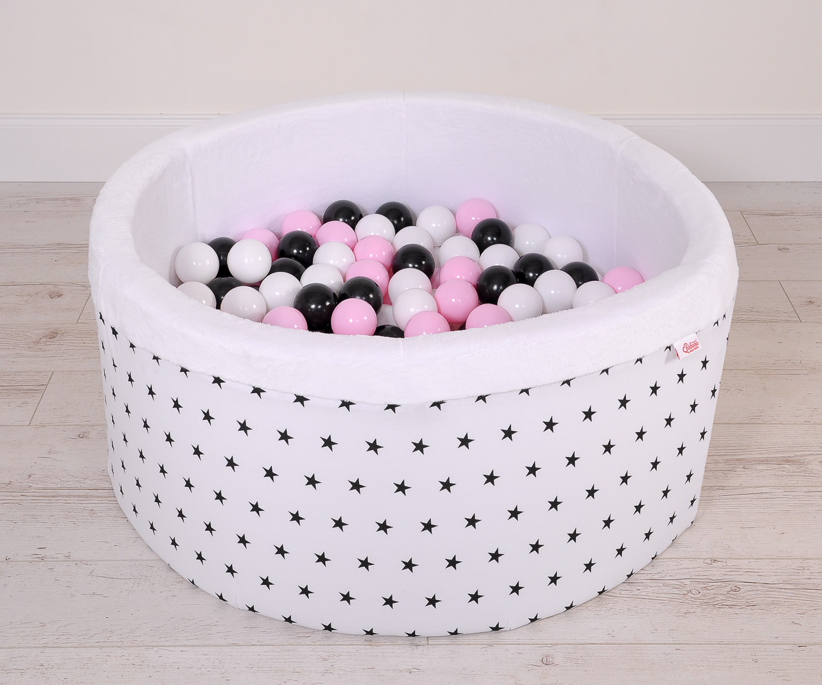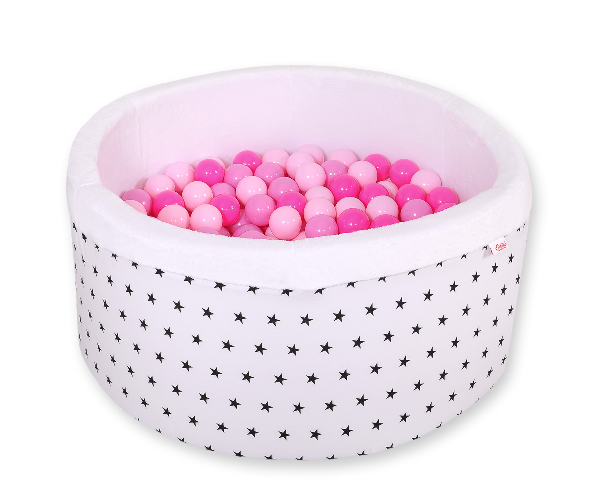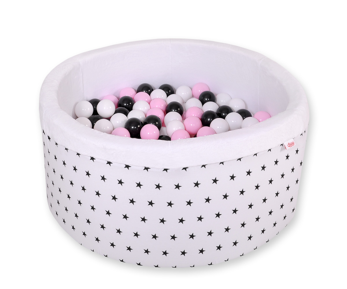 Bällebad aus Minkystoff mit Bällen 200st - schwarze Sternchen Das bunte Bällebad eignet sich hervorragend um darin Draußen und in Haus zu spielen. Die bunten Bälle sind entwicklungsfördernd für das Kind. Der Pool ist aus weichem Schaumstoff gefertigt, bietet dadurch viel Sicherheit beim spielen.