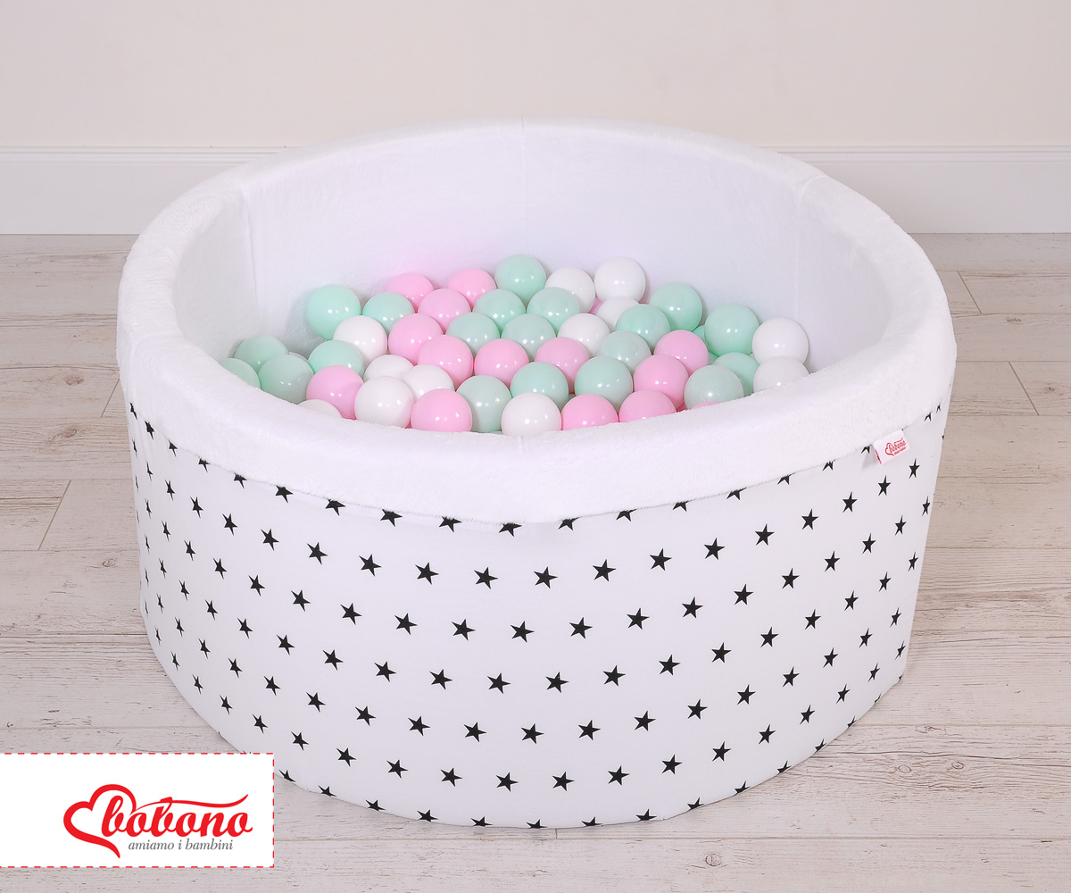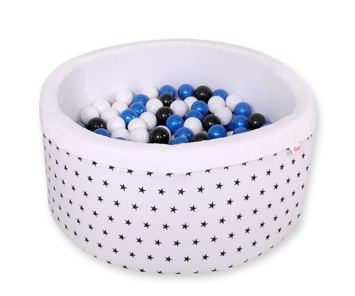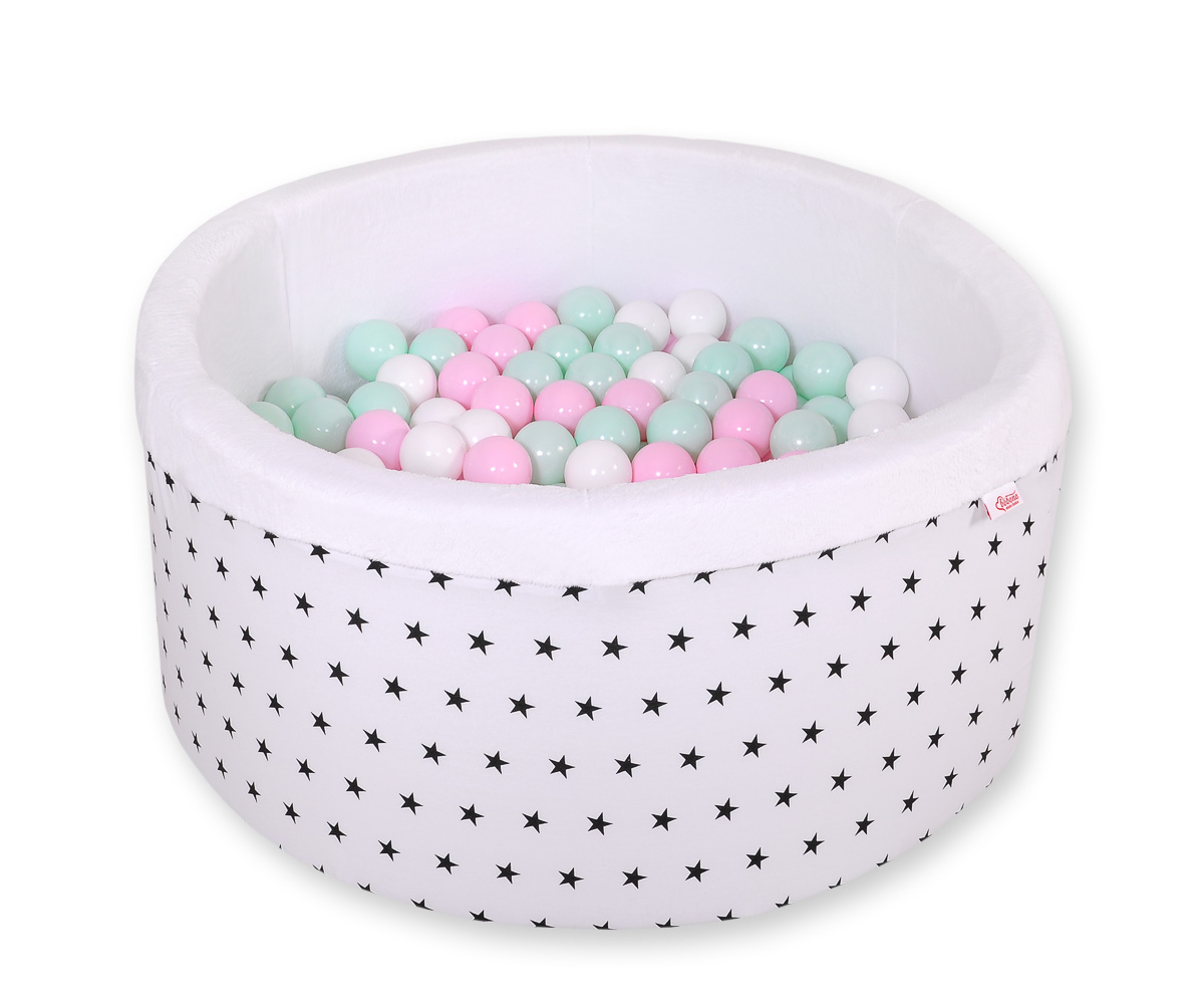 Bällebad aus Minkystoff mit Bällen 200st - schwarze Sternchen Das bunte Bällebad eignet sich hervorragend um darin Draußen und in Haus zu spielen. Die bunten Bälle sind entwicklungsfördernd für das Kind. Der Pool ist aus weichem Schaumstoff gefertigt, bietet dadurch viel Sicherheit beim spielen.