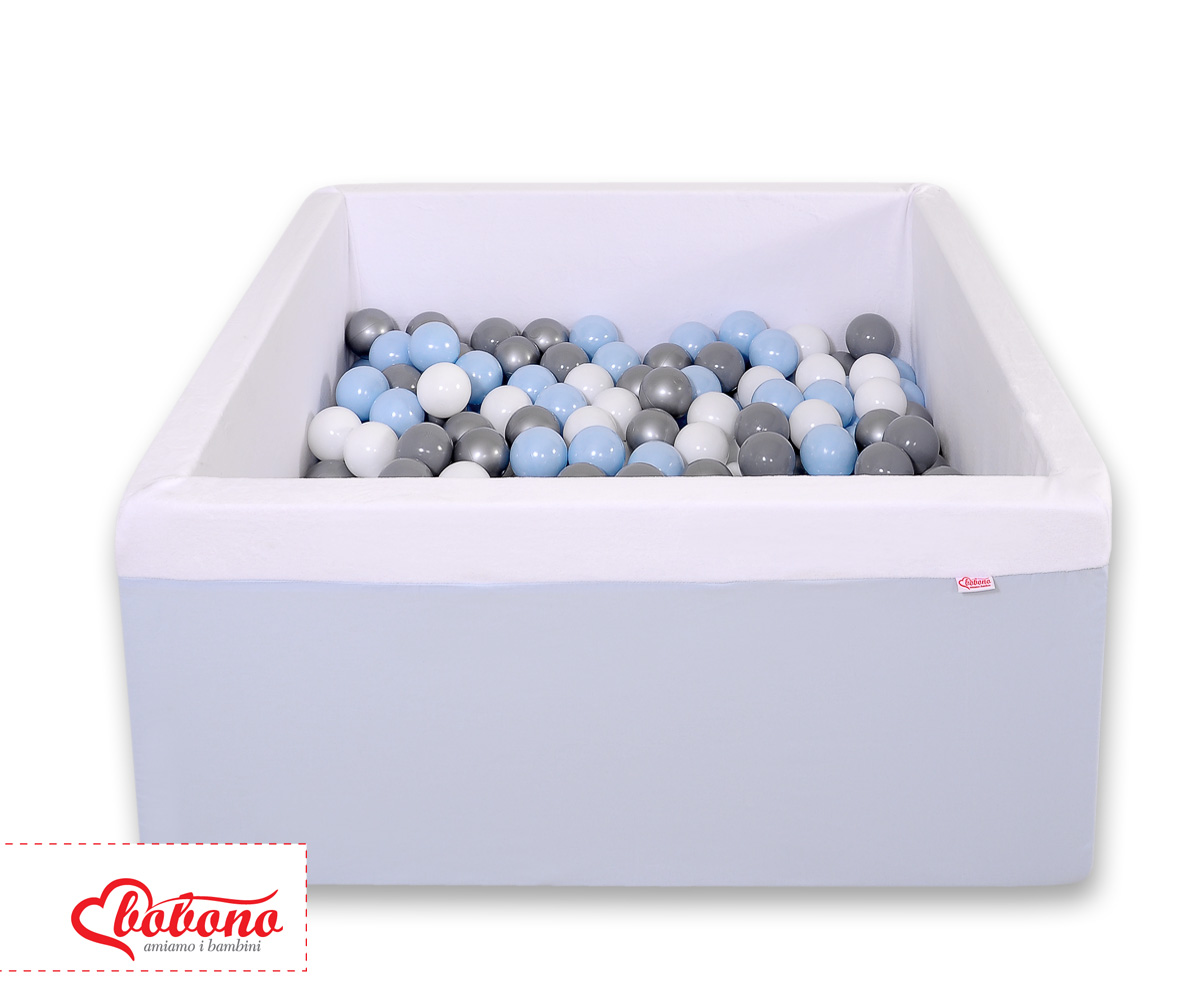 Das Bällebad hat die Form eines Quadrats 90x90cm. Die Höhe beträgt 40 cm. Es ist aus Schaumstoff angefertigt. Der Bezug ist aus reiner Baumwolle und weichem Minkyvlies genäht. Durch die eingenähten Reißverschlüsse kann der Bezug zum waschen abgenommen werden.