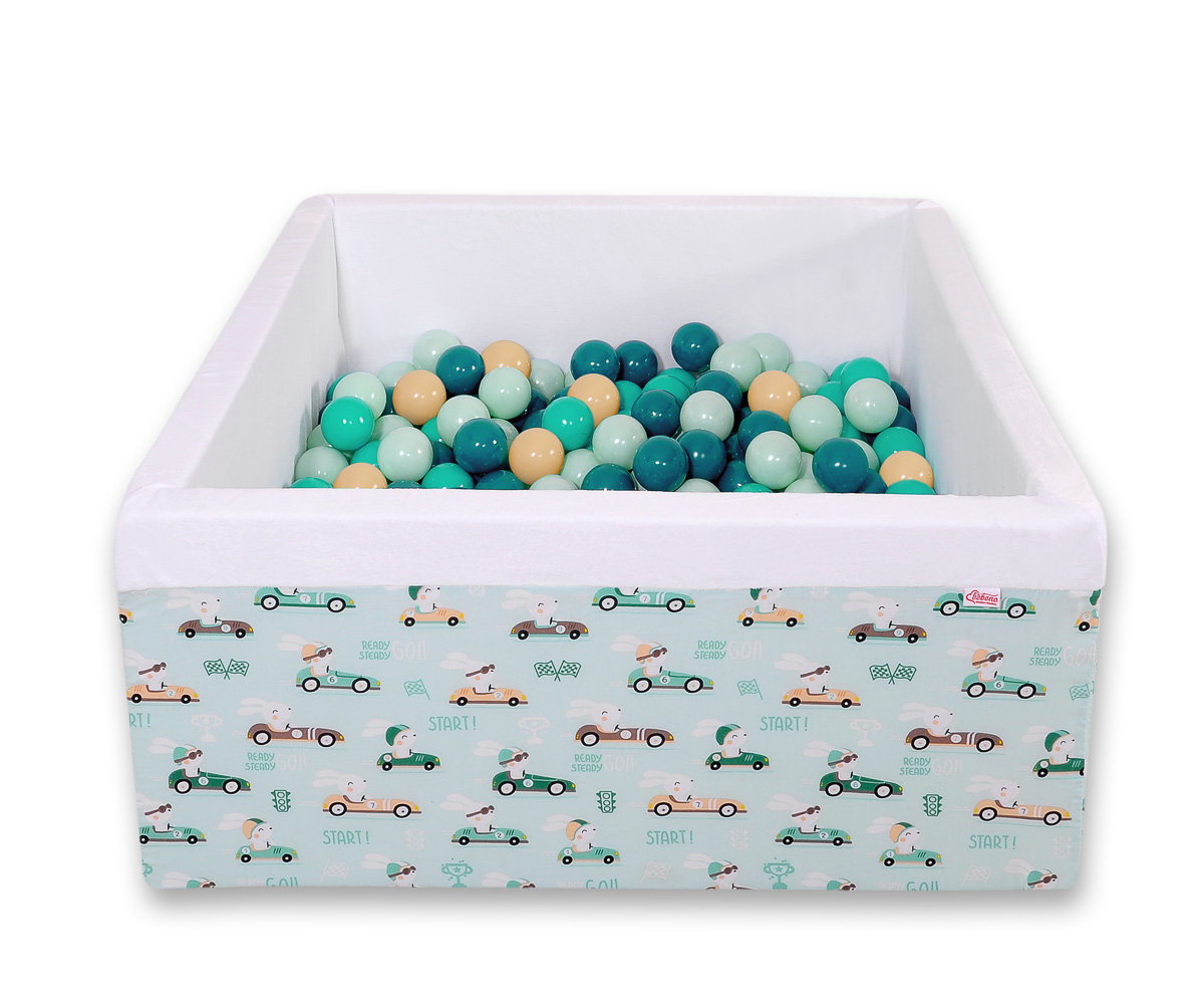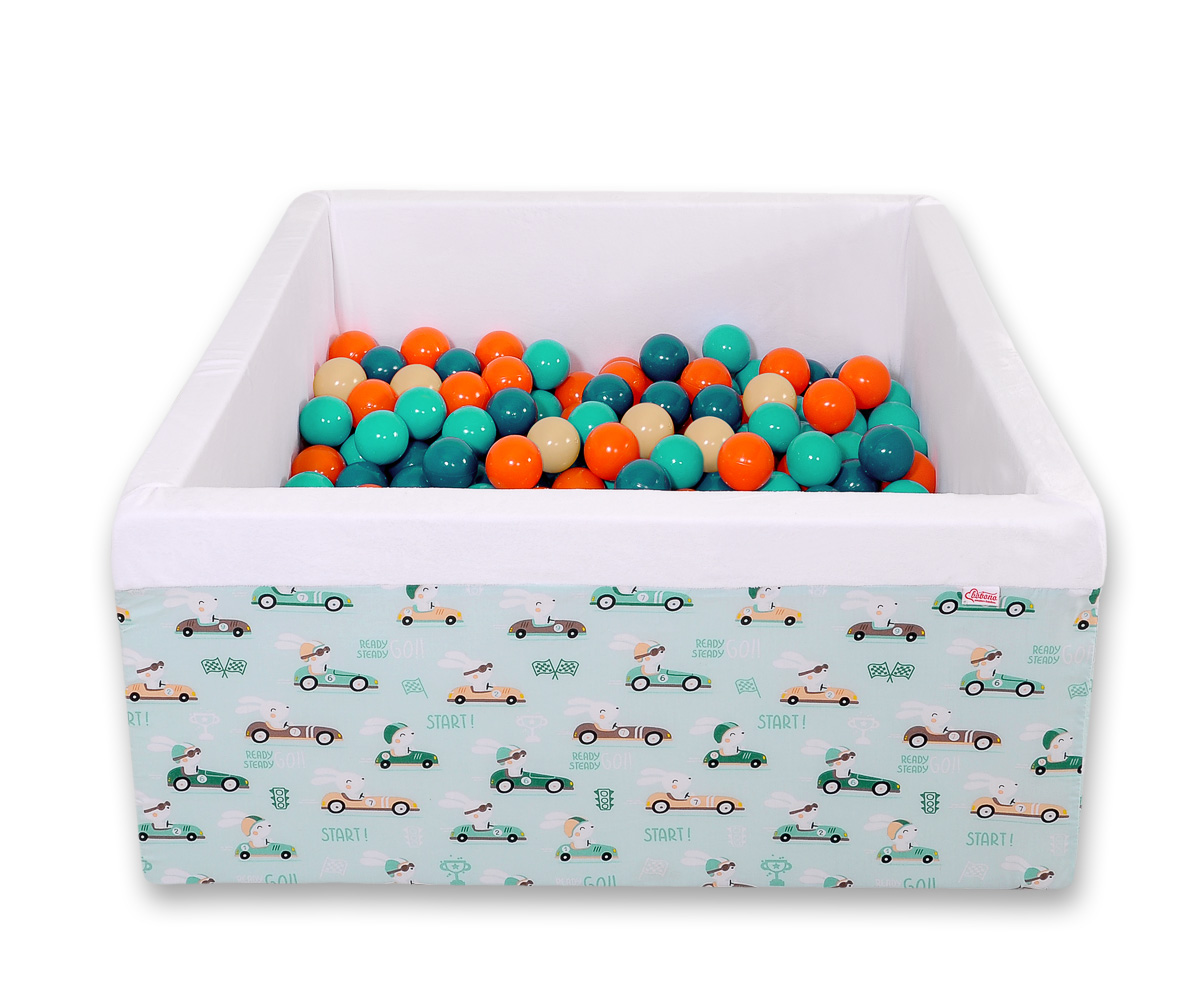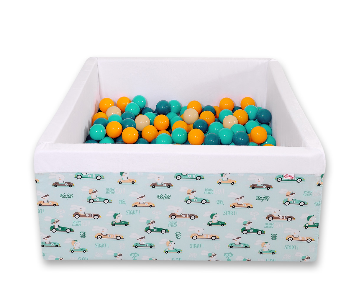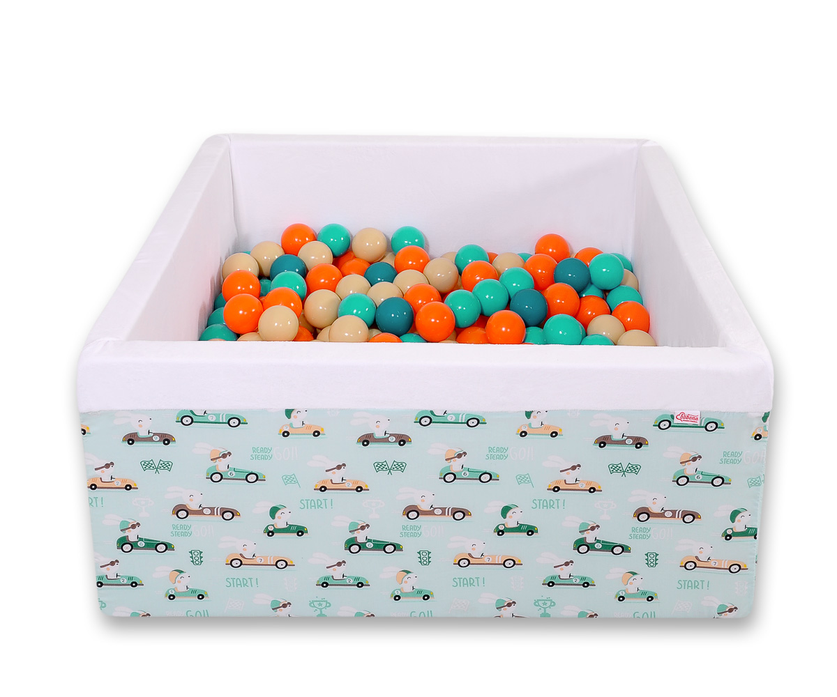 Das Bällebad hat die Form eines Quadrats 90x90cm. Die Höhe beträgt 40 cm. Es ist aus Schaumstoff angefertigt. Der Bezug ist aus reiner Baumwolle und weichem Minkyvlies genäht. Durch die eingenähten Reißverschlüsse kann der Bezug zum waschen abgenommen werden.