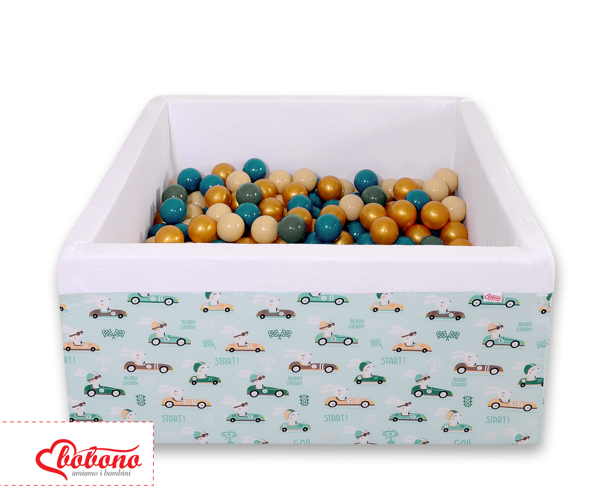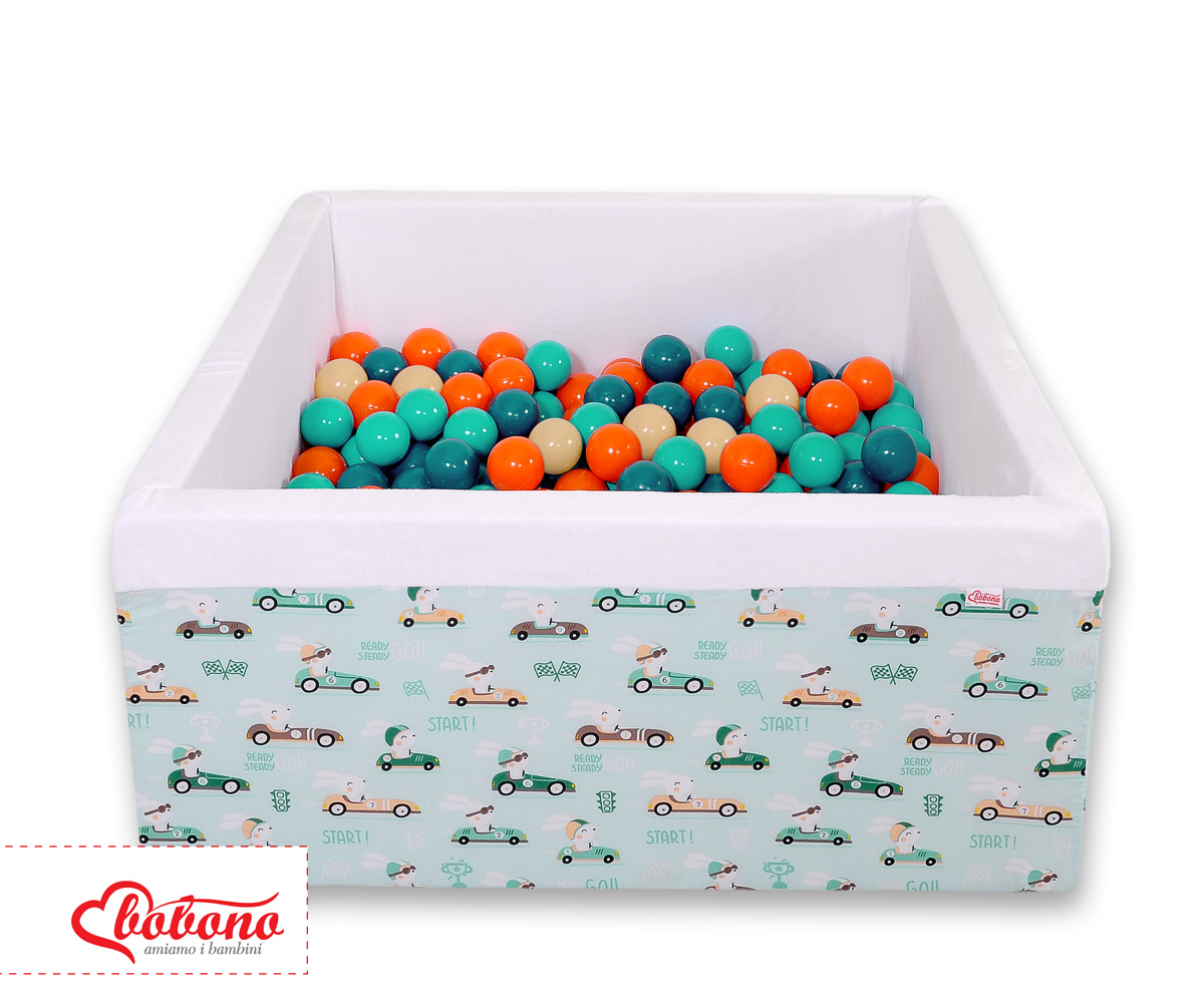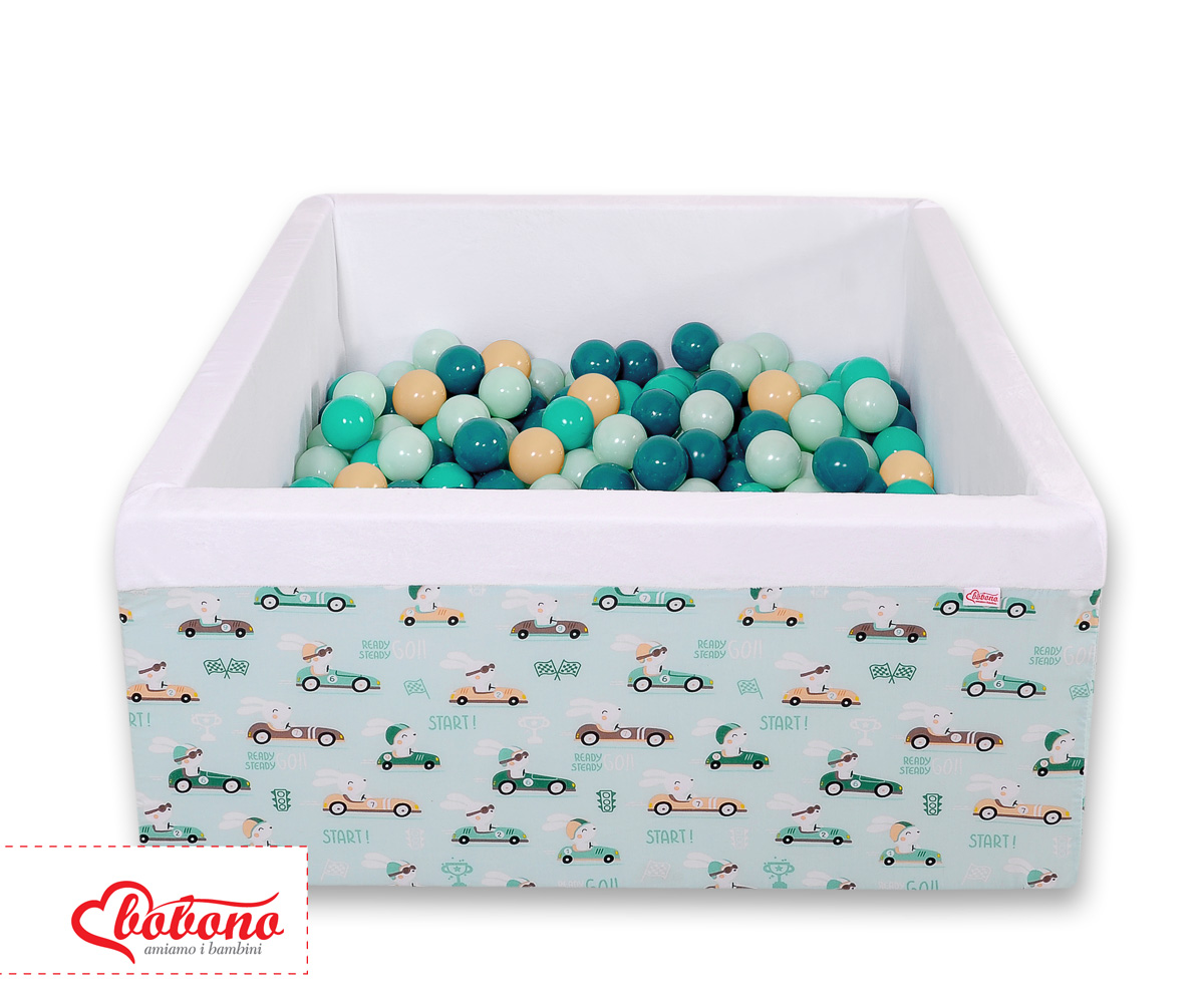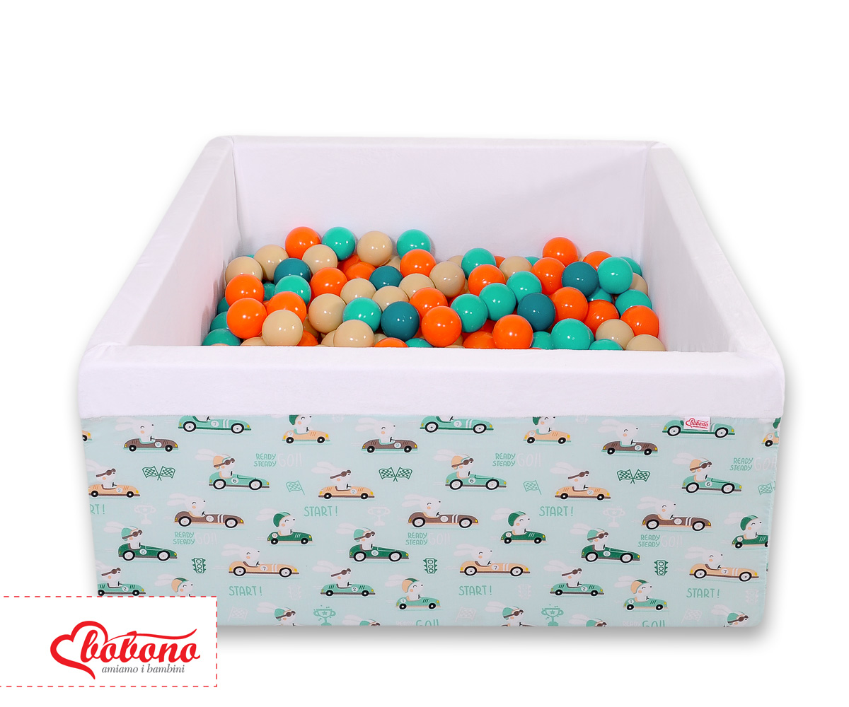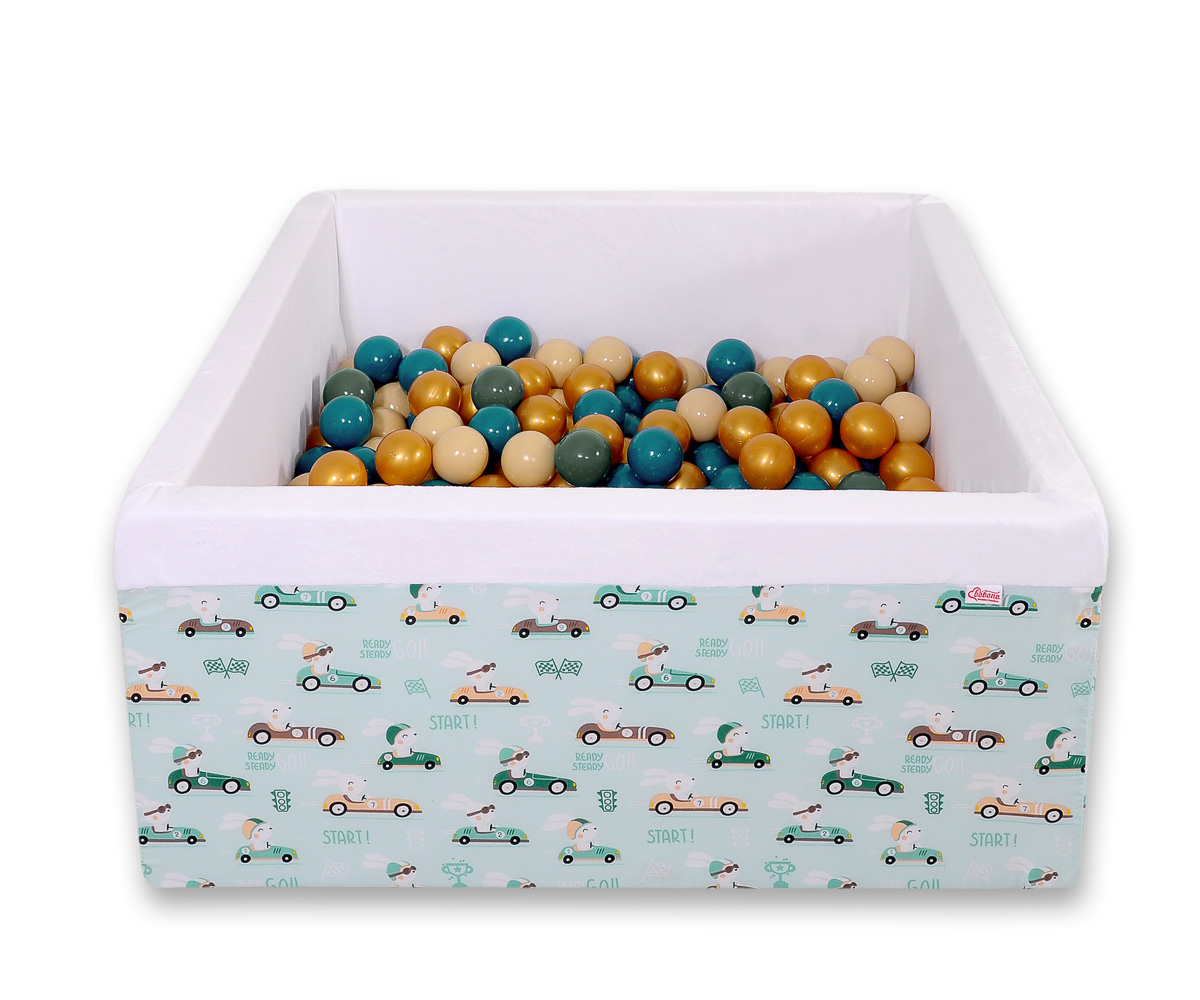 Das Bällebad hat die Form eines Quadrats 90x90cm. Die Höhe beträgt 40 cm. Es ist aus Schaumstoff angefertigt. Der Bezug ist aus reiner Baumwolle und weichem Minkyvlies genäht. Durch die eingenähten Reißverschlüsse kann der Bezug zum waschen abgenommen werden.