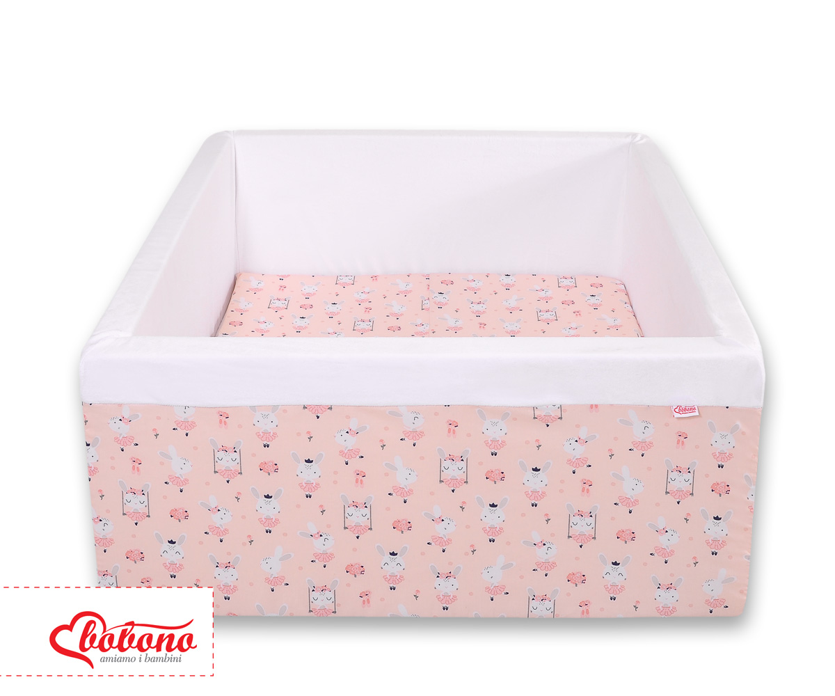 Das Bällebad hat die Form eines Quadrats 90x90cm. Die Höhe beträgt 40 cm. Es ist aus Schaumstoff angefertigt. Der Bezug ist aus reiner Baumwolle und weichem Minkyvlies genäht. Durch die eingenähten Reißverschlüsse kann der Bezug zum waschen abgenommen werden.