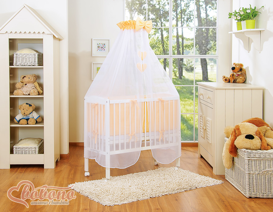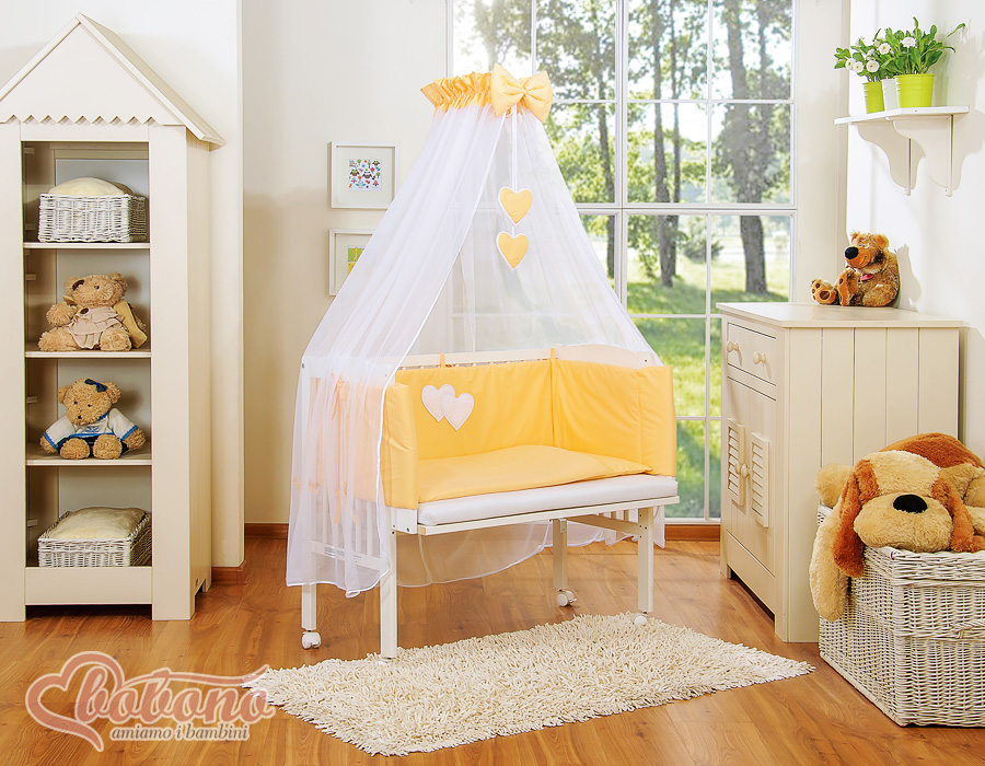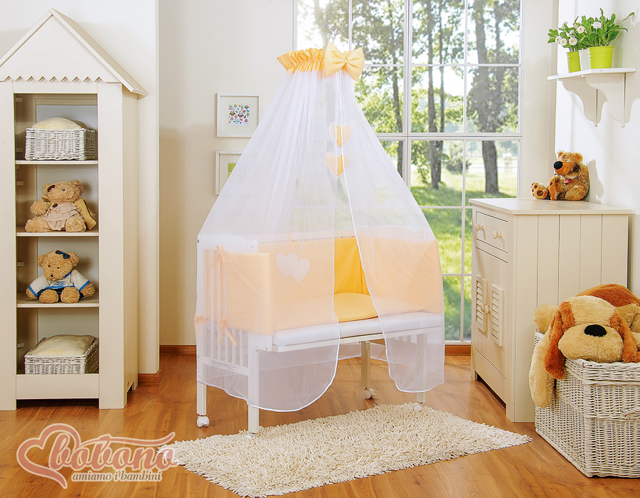 Beistellbett FABIO mit Matratze und Bettwäsche Set - Hängende Herzen pfirsich Wir präsentieren Ihnen wunderschönes Beistellbettchen welches aus schadstofffreien Materialien angefertigt wurde. Erfüllt die gültigen EU Normen. Wichtigste Eigenschaften:
